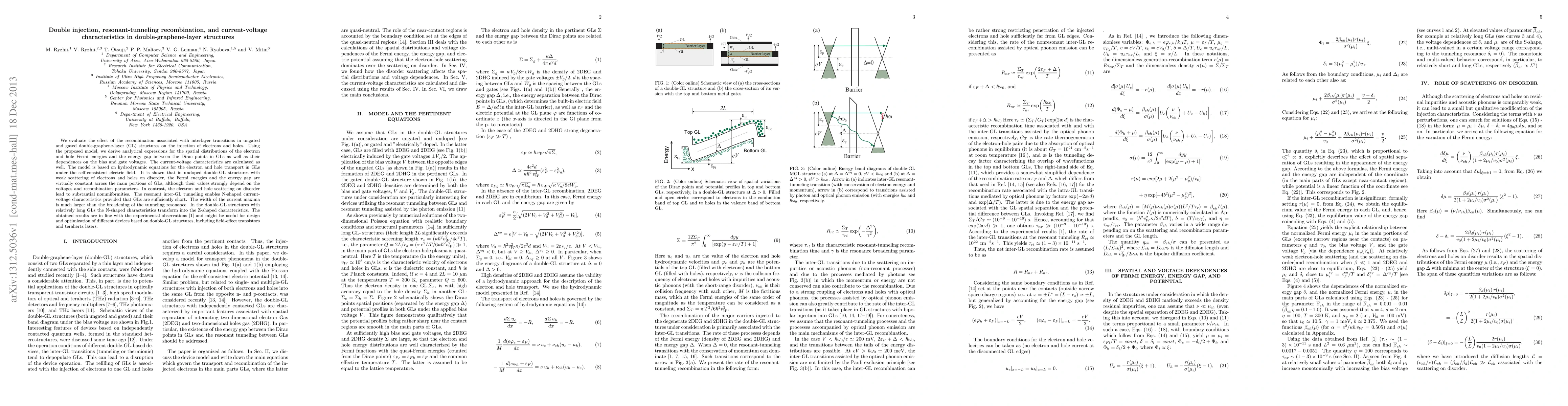 This paper investigates the recombination and current-voltage characteristics in double-graphene-layer structures, deriving analytical expressions for Fermi energies and energy gaps under bias and gate voltages. It finds that resonant tunneling can produce N-shaped current-voltage characteristics in short layers, transforming into Z-shaped in longer layers, with implications for device design.
