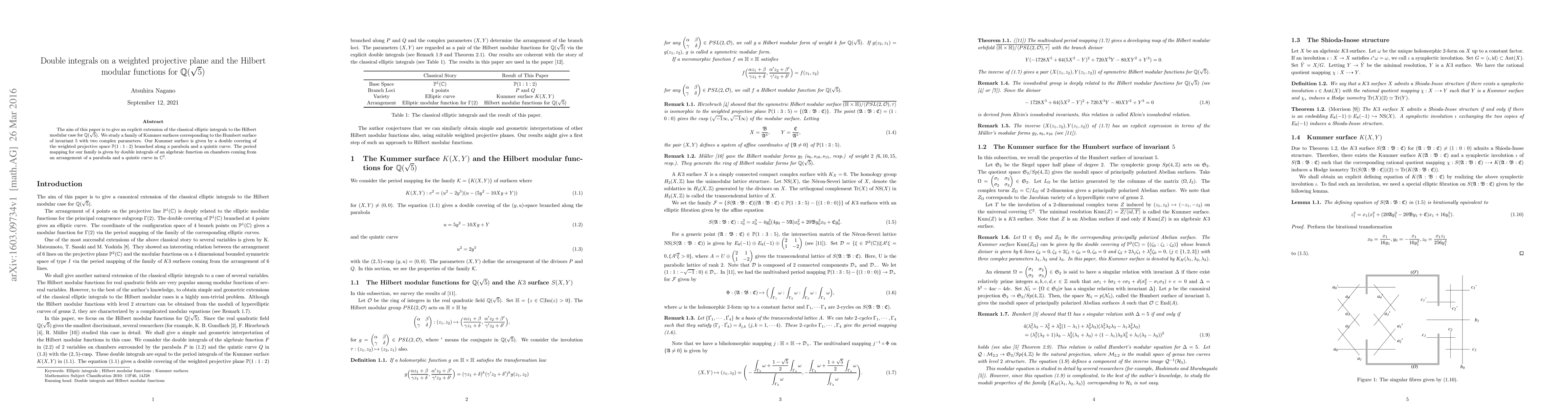 The aim of this paper is to give an explicit extension of the classical elliptic integrals to the Hilbert modular case for $\mathbb{Q}(\sqrt{5})$. We study a family of Kummer surfaces corresponding to the Humbert surface of invariant $5$ with two complex parameters. Our Kummer surface is given by a double covering of the weighted projective space $\mathbb{P}(1:1:2)$ branched along a parabola and a quintic curve. The period mapping for our family is given by double integrals of an algebraic function on chambers coming from an arrangement of a parabola and a quintic curve in $\mathbb{C}^2$.