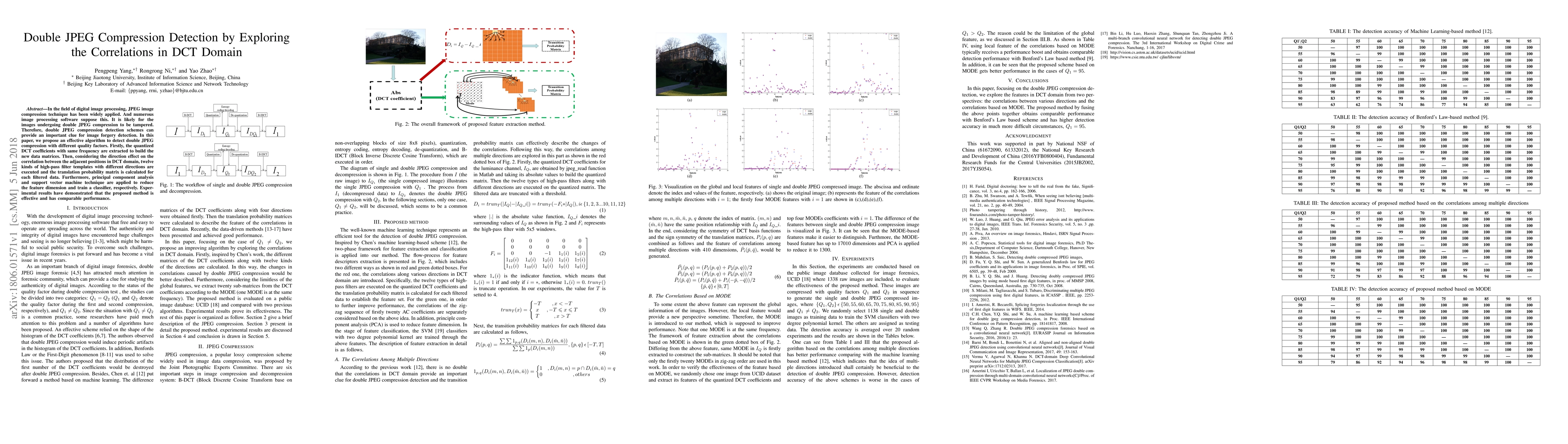 This paper proposes an algorithm to detect double JPEG compression using DCT domain analysis. It extracts quantized DCT coefficients, applies high-pass filters, and uses PCA and SVM to classify images, demonstrating effective detection of double compression with varying quality factors.