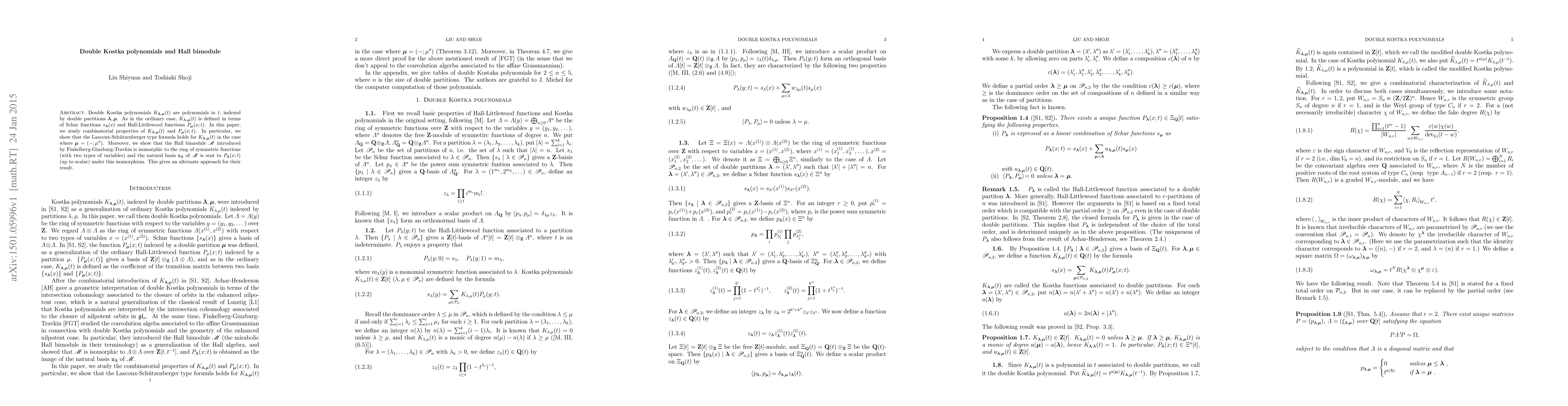 This paper explores combinatorial properties of double Kostka polynomials and Hall-Littlewood functions associated with double partitions, proving a Lascoux-Schutzenberger type formula for specific cases. It also demonstrates an isomorphism between the Hall bimodule and the ring of symmetric functions with two variable types.