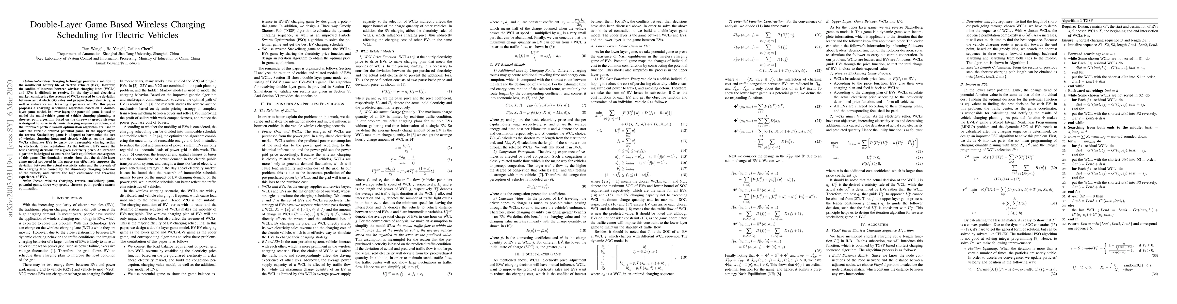 This paper proposes a double-layer game-based wireless charging scheduling algorithm for electric vehicles (EVs) that addresses the conflict between wireless charging lanes (WCLs) and EVs. It uses a potential game for vehicle charging planning and a reverse Stackelberg game for cost harmonization, achieving Nash equilibrium and improving EV endurance and experience.