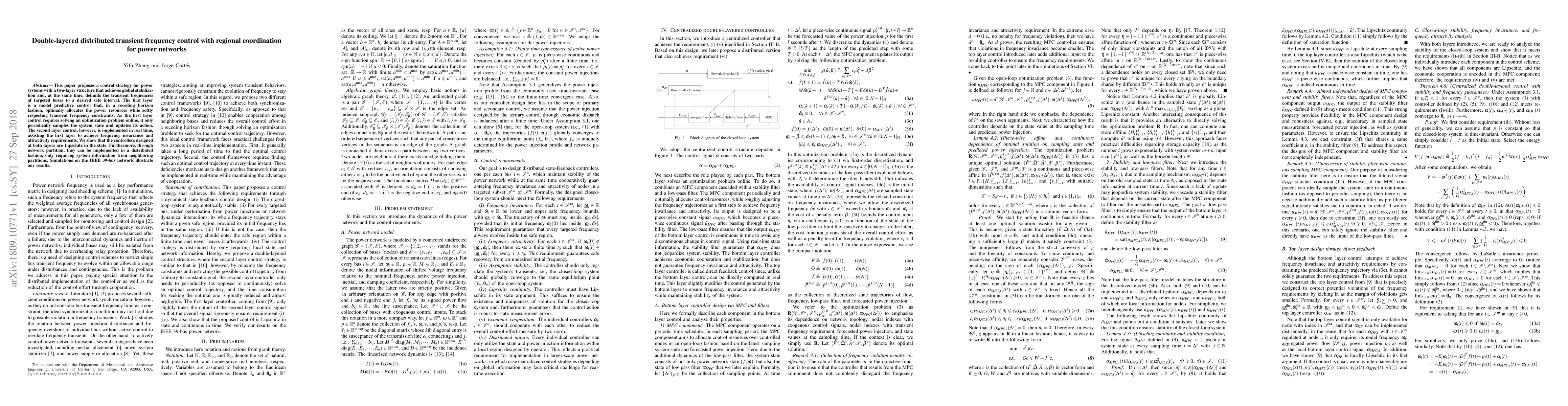 This paper introduces a two-layer control strategy for power networks that ensures global stabilization and maintains transient frequencies within a safe range. The first layer uses model predictive control to optimize power allocation, while the second layer provides real-time assistance to meet frequency requirements. Both layers are Lipschitz in state and can be distributed across network partitions.