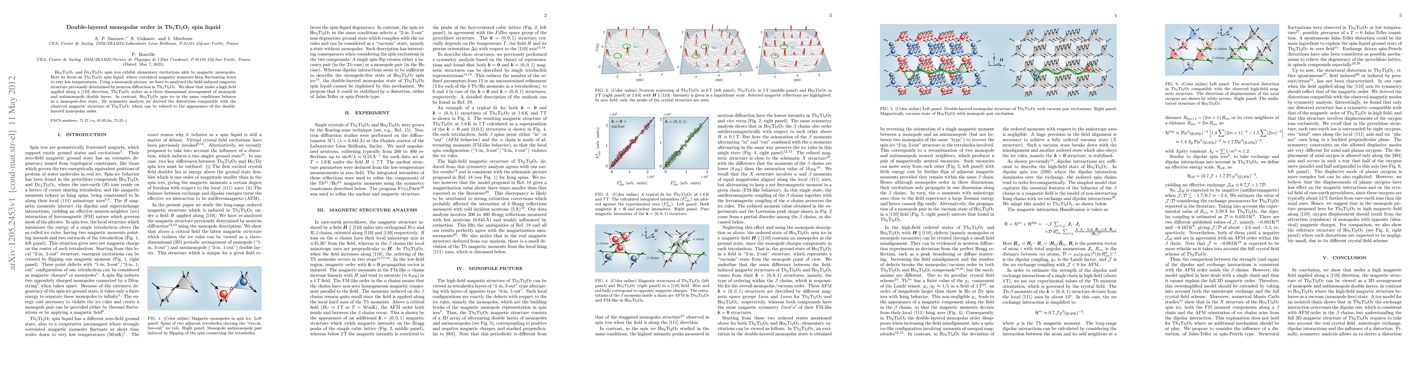 This paper investigates the magnetic structure of Tb2Ti2O7 spin liquid under a high magnetic field, revealing a double-layered monopolar order composed of monopoles and antimonopoles, contrasting with the monopole-free state of Ho2Ti2O7 spin ice. The study uses symmetry analysis to explain the distortions leading to this unique magnetic ordering.