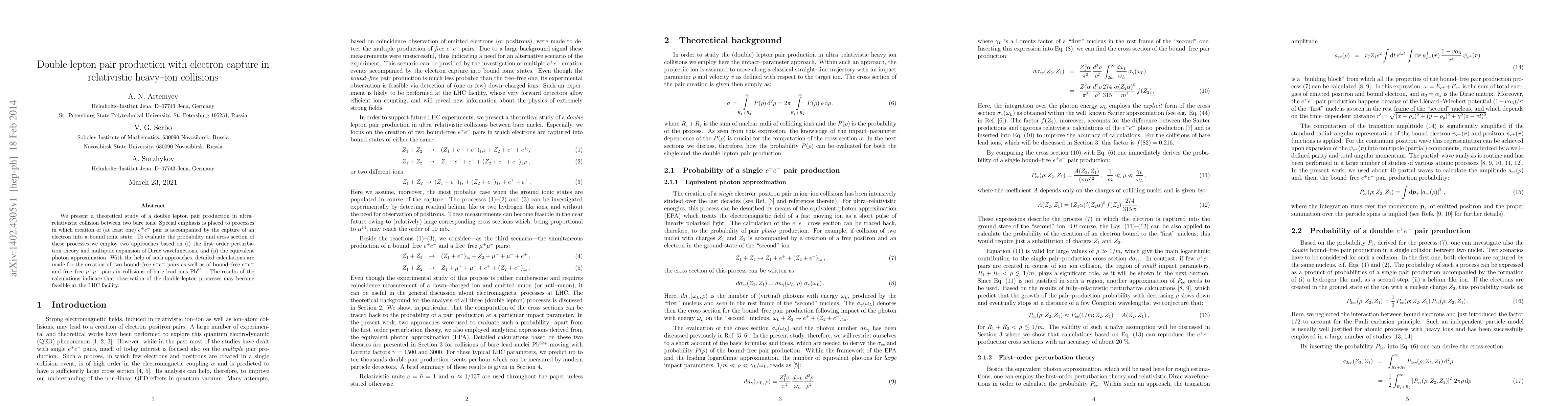 We present a theoretical study of a double lepton pair production in ultra--relativistic collision between two bare ions. Special emphasis is placed to processes in which creation of (at least one) $e^+ e^-$ pair is accompanied by the capture of an electron into a bound ionic state. To evaluate the probability and cross section of these processes we employ two approaches based on (i) the first--order perturbation theory and multipole expansion of Dirac wavefunctions, and (ii) the equivalent photon approximation. With the help of such approaches, detailed calculations are made for the creation of two bound--free $e^+ e^-$ pairs as well as of bound--free $e^+ e^-$ and free--free $\mu^+ \mu^-$ pairs in collisions of bare lead ions Pb$^{82+}$. The results of the calculations indicate that observation of the double lepton processes may become feasible at the LHC facility.