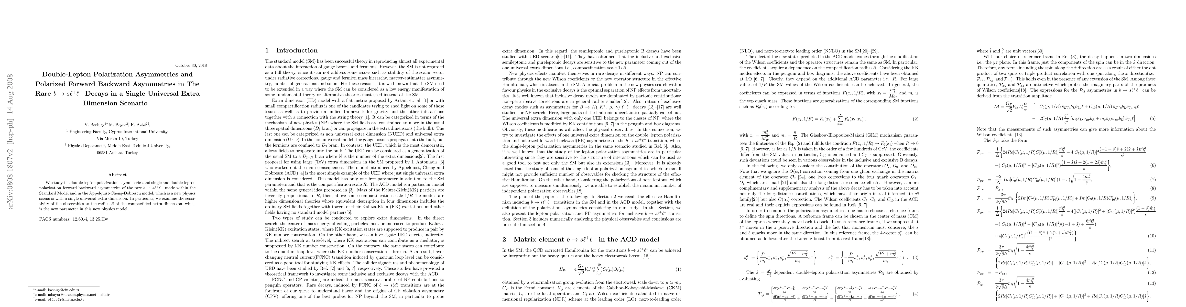 We study the double-lepton polarization asymmetries and single and double-lepton polarization forward backward asymmetries of the rare b \to s \ell^+ \ell^- mode within the Standard Model and in the Appelquist-Cheng-Dobrescu model, which is a new physics scenario with a single universal extra dimension. In particular, we examine the sensitivity of the observables to the radius R of the compactified extra-dimension, which is the new parameter in this new physics model.