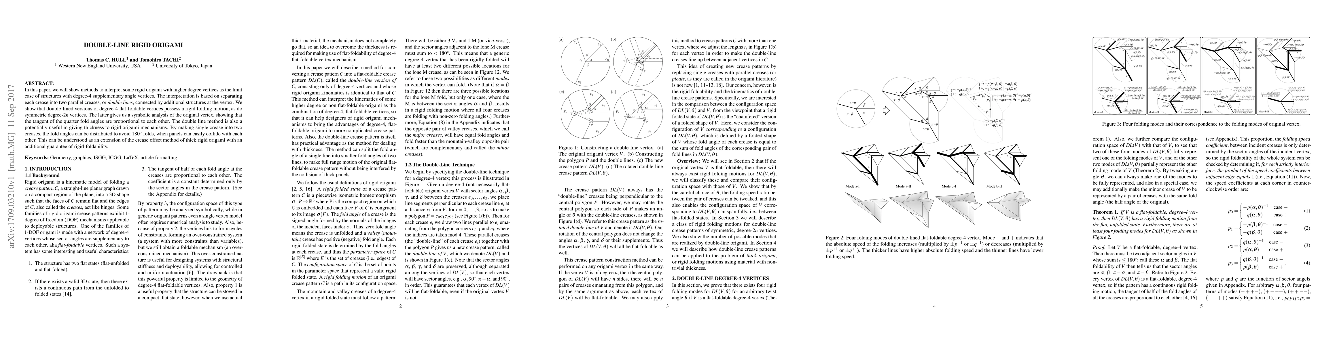This paper presents a method to reinterpret rigid origami with higher-degree vertices as the limit of structures with degree-4 vertices by introducing double lines along creases. This double-line approach ensures rigid folding motions and can provide thickness to rigid origami mechanisms by distributing fold angles to prevent collisions.