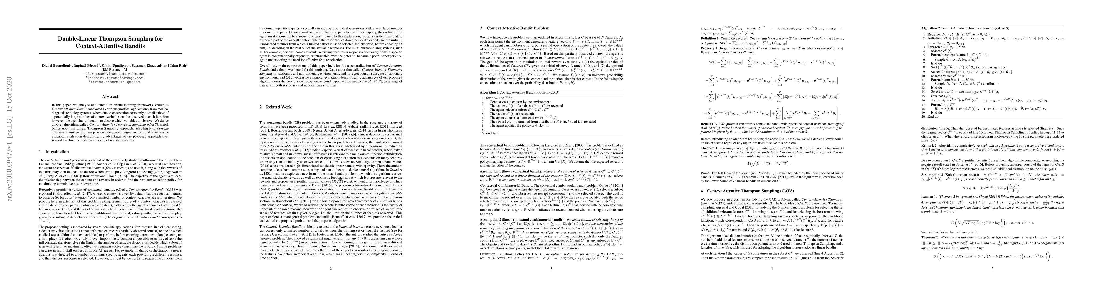 In this paper, we analyze and extend an online learning framework known as Context-Attentive Bandit, motivated by various practical applications, from medical diagnosis to dialog systems, where due to observation costs only a small subset of a potentially large number of context variables can be observed at each iteration;however, the agent has a freedom to choose which variables to observe. We derive a novel algorithm, called Context-Attentive Thompson Sampling (CATS), which builds upon the Linear Thompson Sampling approach, adapting it to Context-Attentive Bandit setting. We provide a theoretical regret analysis and an extensive empirical evaluation demonstrating advantages of the proposed approach over several baseline methods on a variety of real-life datasets
