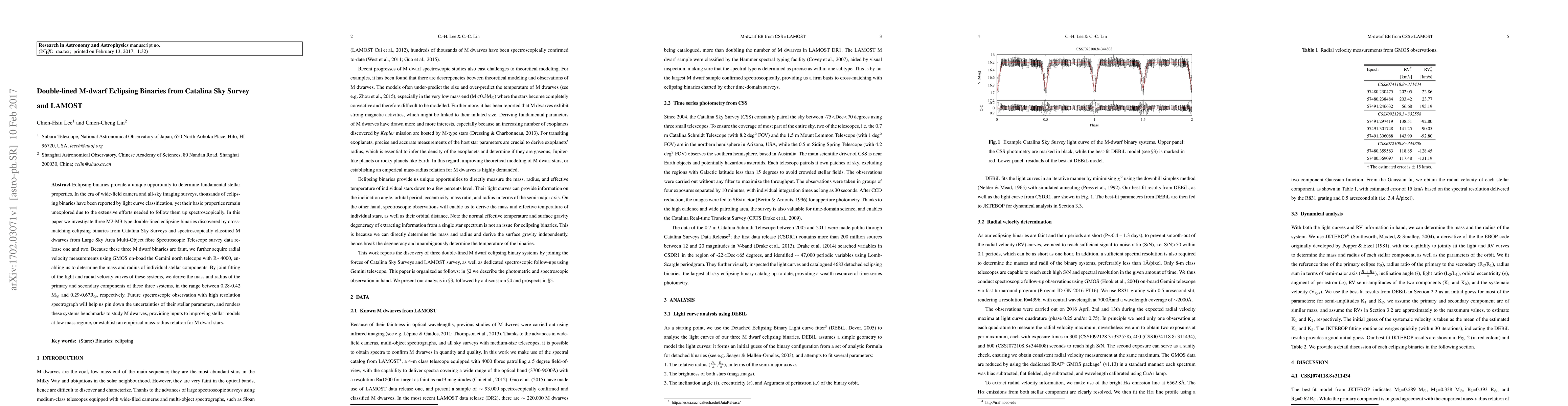 Eclipsing binaries provide a unique opportunity to determine fundamental stellar properties. In the era of wide-field cameras and all-sky imaging surveys, thousands of eclipsing binaries have been reported through light curve classification, yet their basic properties remain unexplored due to the extensive efforts needed to follow them up spectroscopically. In this paper we investigate three M2-M3 type double-lined eclipsing binaries discovered by cross-matching eclipsing binaries from the Catalina Sky Survey wtih spectroscopically classified M dwarfs from the Large Sky Area Multi-Object Fiber Spectroscopic Telescope survey data release one and two. Because these three M dwarf binaries are faint, we further acquire radial velocity measurements using GMOS on the Gemini North telescope with R~40000, enabling us to determine the mass and radius of individual stellar components. By jointly fitting the light and radial velocity curves of these systems, we derive the mass and radius of the primary and secondary components of these three systems, in the range between 0.28-0.42 M_sun and 0.29-0.67 R_sun, respectively. Future observations with a high resolution spectrograph will help us pin down the uncertainties in their stellar parameters, and render these systems benchmarks to study m dwarfs, providing inputs to improving stellar models in the low mass regime, or establishing an empirical mass-radius relation for M dwarf stars.