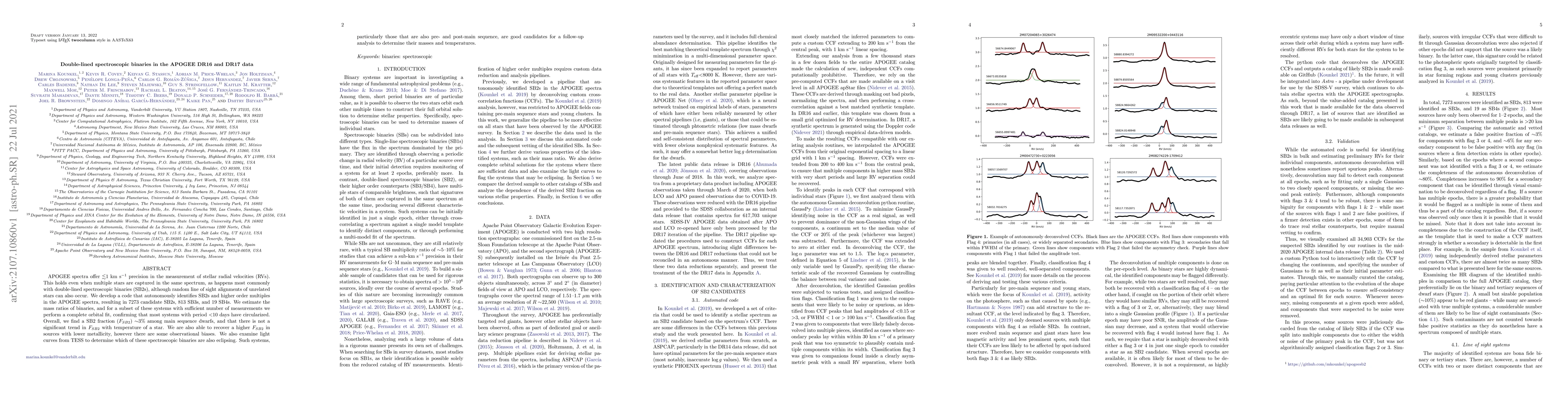 APOGEE spectra offer $\lesssim$1 km s$^{-1}$ precision in the measurement of stellar radial velocities (RVs). This holds even when multiple stars are captured in the same spectrum, as happens most commonly with double-lined spectroscopic binaries (SB2s), although random line of sight alignments of unrelated stars can also occur. We develop a code that autonomously identifies SB2s and higher order multiples in the APOGEE spectra, resulting in 7273 candidate SB2s, 813 SB3s, and 19 SB4s. We estimate the mass ratios of binaries, and for a subset of these systems with sufficient number of measurements we perform a complete orbital fit, confirming that most systems with period $<$10 days have circularized. Overall, we find a SB2 fraction ($F_{SB2}$) $\sim$3\% among main sequence dwarfs, and that there is not a significant trend in $F_{SB2}$ with temperature of a star. We are also able to recover a higher $F_{SB2}$ in sources with lower metallicity, however there are some observational biases. We also examine light curves from TESS to determine which of these spectroscopic binaries are also eclipsing. Such systems, particularly those that are also pre- and post-main sequence, are good candidates for a follow-up analysis to determine their masses and temperatures.