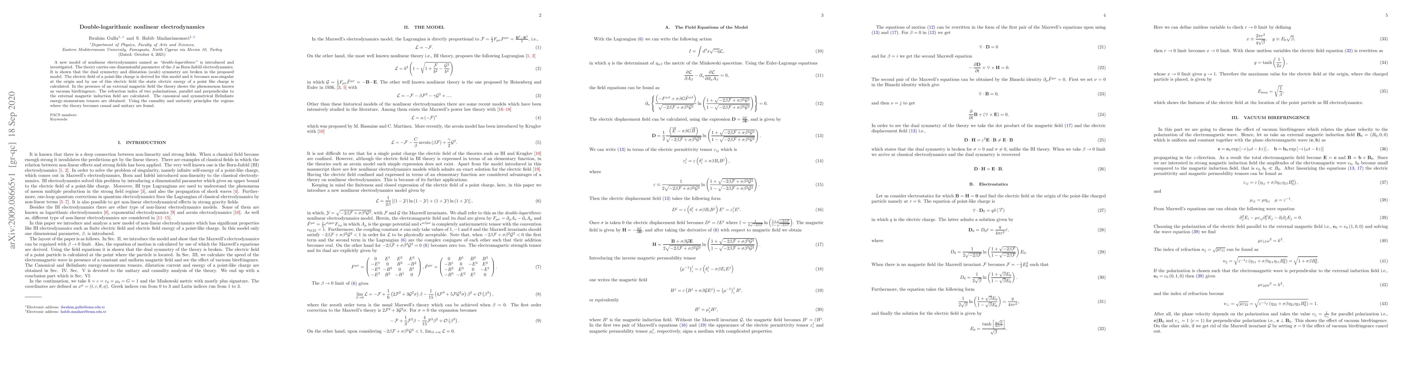 A new model of nonlinear electrodynamics named as \emph{"double-logarithmic"} is introduced and investigated. The theory carries one dimensionful parameter of the $\beta$ as Born-Infeld electrodynamics. It is shown that the dual symmetry and dilatation (scale) symmetry are broken in the proposed model. The electric field of a point-like charge is derived for this model and it becomes non-singular at the origin and by use of this electric field the static electric energy of a point like charge is calculated. In the presence of an external magnetic field the theory shows the phenomenon known as vacuum birefringence. The refraction index of two polarizations, parallel and perpendicular to the external magnetic induction field are calculated. The canonical and symmetrical Belinfante energy-momentum tensors are obtained. Using the causality and unitarity principles the regions where the theory becomes causal and unitary are found.
