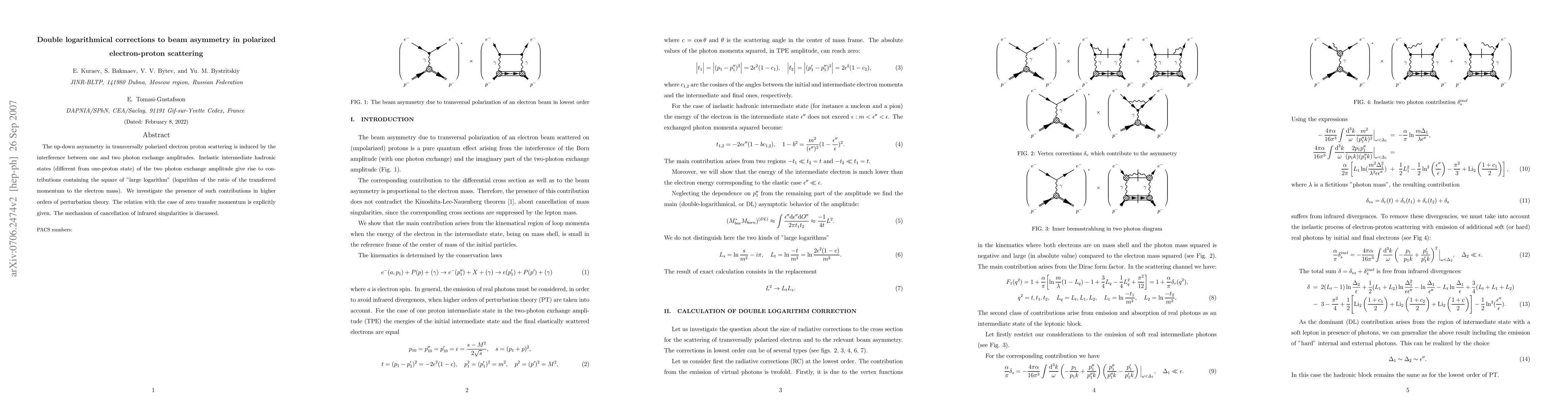 The up-down asymmetry in transversally polarized electron proton scattering is induced by the interference between one and two photon exchange amplitudes. Inelastic intermediate hadronic states (different from one-proton state) of the two photon exchange amplitude give rise to contributions containing the square of "large logarithm" (logarithm of the ratio of the transferred momentum to the electron mass). We investigate the presence of such contributions in higher orders of perturbation theory. The relation with the case of zero transfer momentum is explicitly given. The mechanism of cancellation of infrared singularities is discussed.