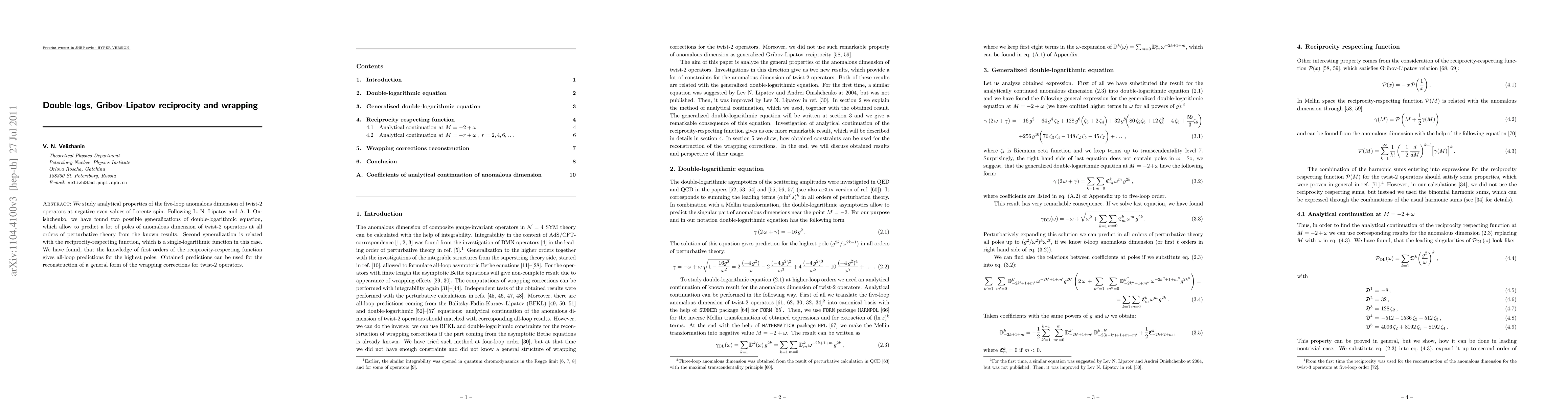 The paper explores the analytical properties of the five-loop anomalous dimension of twist-2 operators at negative even Lorentz spin values. It introduces two generalizations of the double-logarithmic equation, enabling all-order predictions for poles of the anomalous dimension. One generalization is linked to a reciprocity-respecting function, a single-logarithmic function in this case. The study reveals that knowing the first orders of this function provides all-loop predictions for the highest poles, facilitating the reconstruction of wrapping corrections for twist-2 operators.