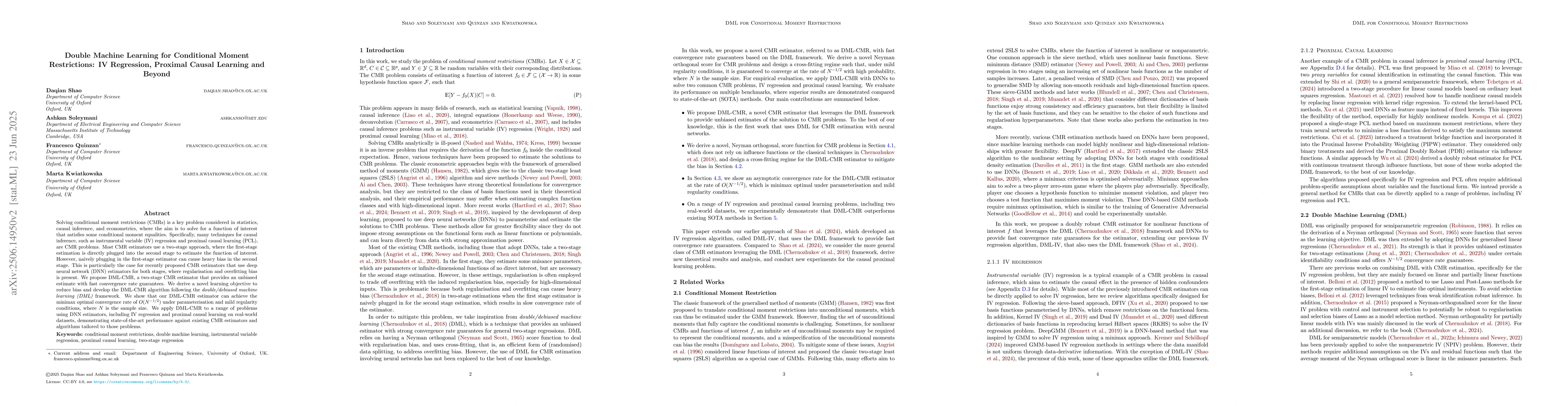 Solving conditional moment restrictions (CMRs) is a key problem considered in statistics, causal inference, and econometrics, where the aim is to solve for a function of interest that satisfies some conditional moment equalities. Specifically, many techniques for causal inference, such as instrumental variable (IV) regression and proximal causal learning (PCL), are CMR problems. Most CMR estimators use a two-stage approach, where the first-stage estimation is directly plugged into the second stage to estimate the function of interest. However, naively plugging in the first-stage estimator can cause heavy bias in the second stage. This is particularly the case for recently proposed CMR estimators that use deep neural network (DNN) estimators for both stages, where regularisation and overfitting bias is present. We propose DML-CMR, a two-stage CMR estimator that provides an unbiased estimate with fast convergence rate guarantees. We derive a novel learning objective to reduce bias and develop the DML-CMR algorithm following the double/debiased machine learning (DML) framework. We show that our DML-CMR estimator can achieve the minimax optimal convergence rate of $O(N^{-1/2})$ under parameterisation and mild regularity conditions, where $N$ is the sample size. We apply DML-CMR to a range of problems using DNN estimators, including IV regression and proximal causal learning on real-world datasets, demonstrating state-of-the-art performance against existing CMR estimators and algorithms tailored to those problems.