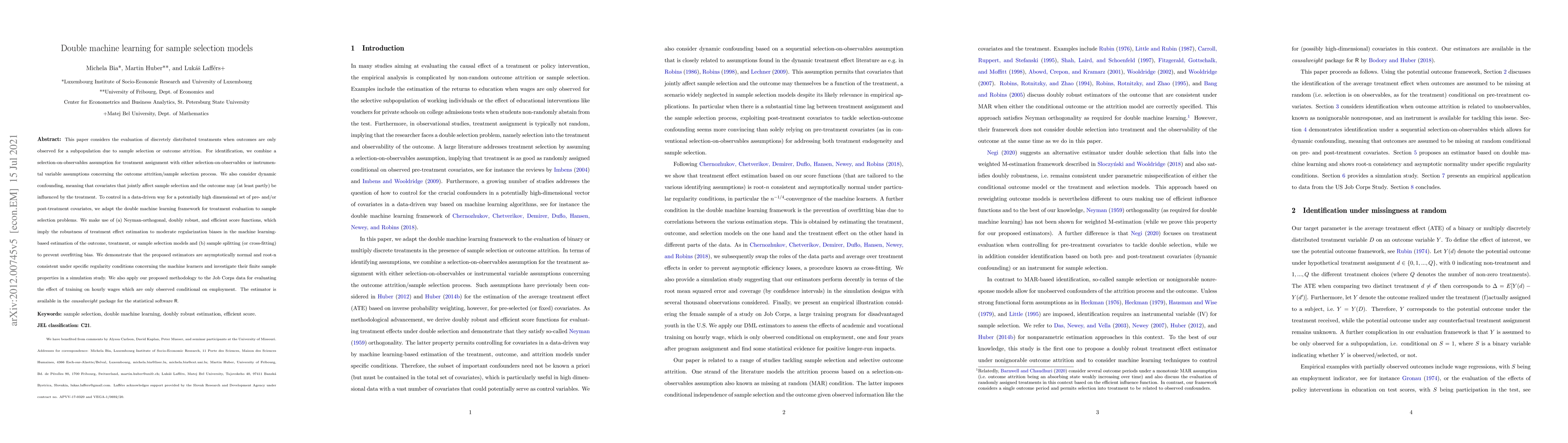 This paper proposes a double machine learning approach for evaluating discrete treatments in sample selection models, addressing dynamic confounding and high-dimensional covariates. It combines robust score functions and sample splitting to ensure consistent and unbiased treatment effect estimates, demonstrated through simulations and an application to Job Corps data.