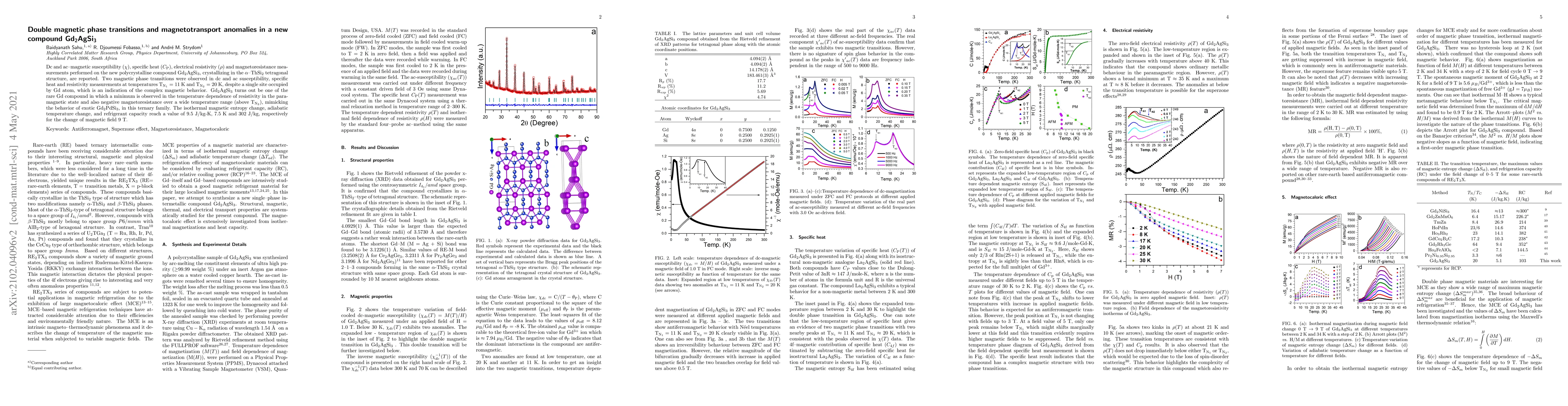 Dc and ac-magnetic susceptibility ($\chi$), specific heat ($C_\mathrm{P}$), electrical resistivity ($\rho$) and magnetoresistance measurements performed on the new polycrystalline compound $\mathrm{Gd_2AgSi_3}$, crystallizing in the $\alpha$-$\mathrm{ThSi_2}$ tetragonal structure, are reported. Two magnetic phase transitions were observed in dc and ac susceptibility, specific heat, and resistivity measurements at temperatures $\mathrm{T_{N_1}} = 11$ K and $\rm{T_{N_2}} = 20$ K, despite a single site occupied by Gd atom, which is an indication of the complex magnetic behavior. $\mathrm{Gd_2AgSi_3}$ turns out to be one of the rare Gd compound in which a minimum is observed in the temperature dependence of resistivity in the paramagnetic state and also negative magnetoresistance over a wide temperature range (above $\rm{T_{N_2}}$), mimicking the behavior of exotic $\mathrm{Gd_2PdSi_3}$, in this ternary family. The isothermal magnetic entropy and adiabatic temperature changes reach a value of 9.5 J/kg-K and 7.5 K respectively for the field change of 9 T.