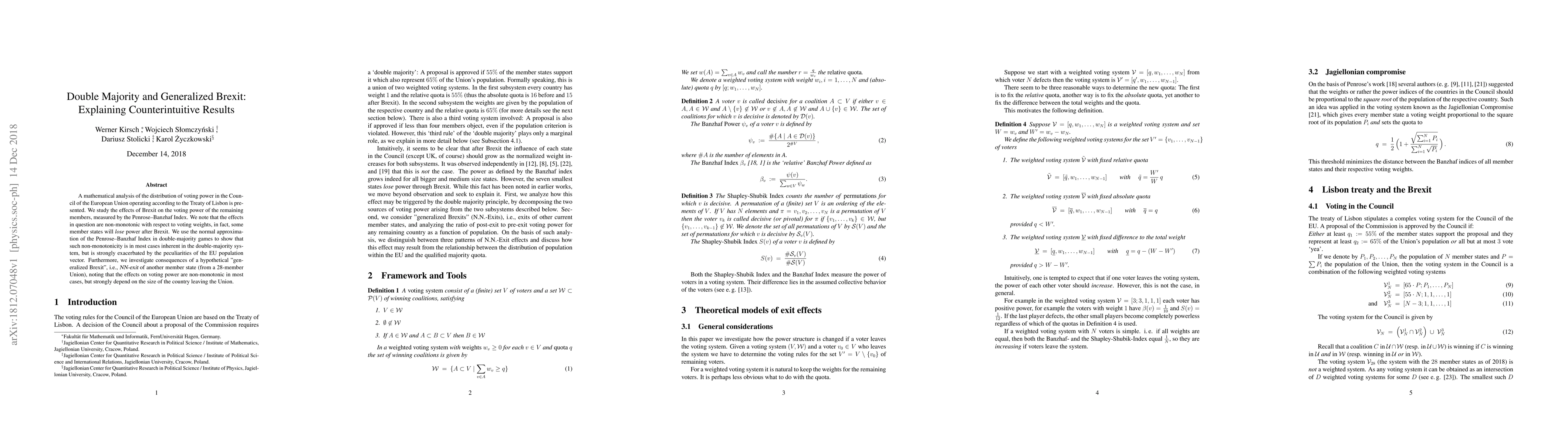 A mathematical analysis of the distribution of voting power in the Council of the European Union operating according to the Treaty of Lisbon is presented. We study the effects of Brexit on the voting power of the remaining members, measured by the Penrose--Banzhaf Index. We note that the effects in question are non-monotonic with respect to voting weights, and that some member states will lose power after Brexit. We use the normal approximation of the Penrose--Banzhaf Index in double-majority games to show that such non-monotonicity is in most cases inherent in the double-majority system, but is strongly exacerbated by the peculiarities of the EU population vector. Furthermore, we investigate consequences of a hypothetical "generalized Brexit", i.e., NN-exit of another member state (from a 28-member Union), noting that the effects on voting power are non-monotonic in most cases, but strongly depend on the size of the country leaving the Union.