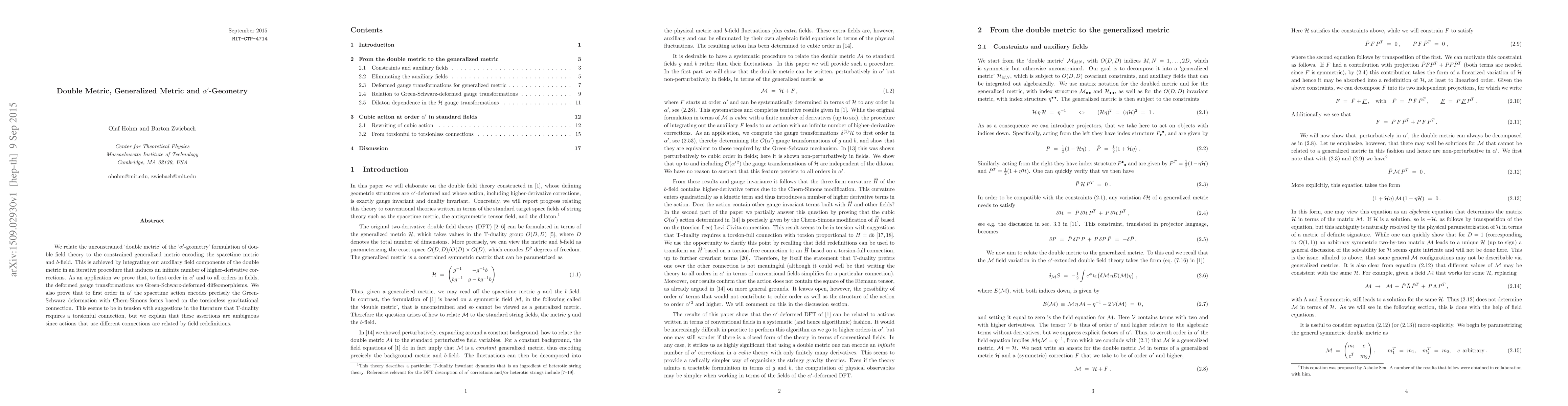 We relate the unconstrained `double metric' of the `$\alpha'$-geometry' formulation of double field theory to the constrained generalized metric encoding the spacetime metric and b-field. This is achieved by integrating out auxiliary field components of the double metric in an iterative procedure that induces an infinite number of higher-derivative corrections. As an application we prove that, to first order in $\alpha'$ and to all orders in fields, the deformed gauge transformations are Green-Schwarz-deformed diffeomorphisms. We also prove that to first order in $\alpha'$ the spacetime action encodes precisely the Green-Schwarz deformation with Chern-Simons forms based on the torsionless gravitational connection. This seems to be in tension with suggestions in the literature that T-duality requires a torsionful connection, but we explain that these assertions are ambiguous since actions that use different connections are related by field redefinitions.