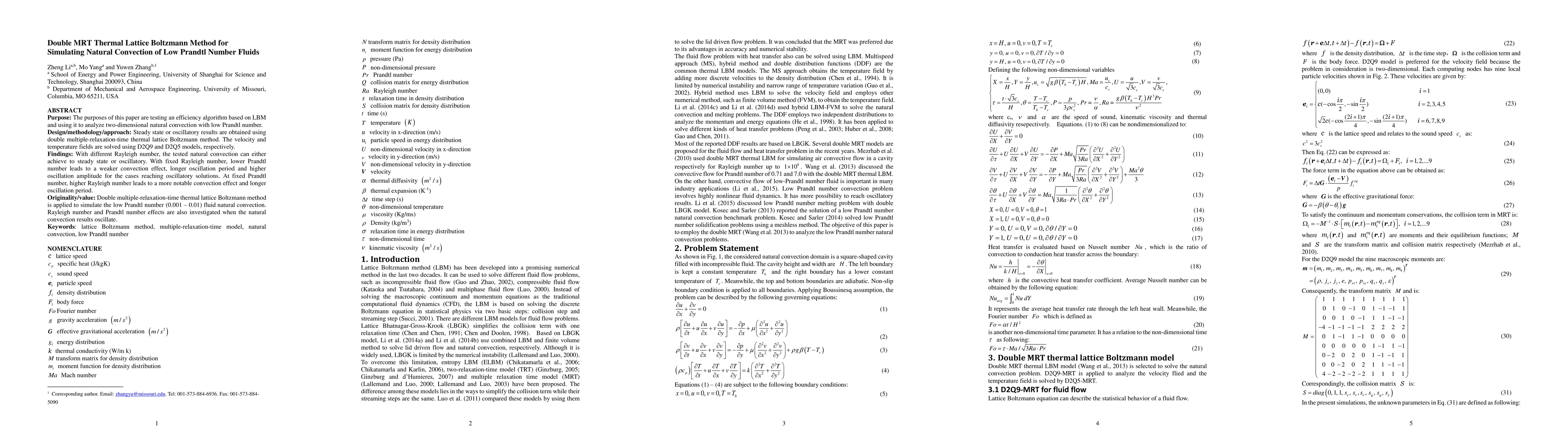 The purposes of this paper are testing an efficiency algorithm based on LBM and using it to analyze two-dimensional natural convection with low Prandtl number. Steady state or oscillatory results are obtained using double multiple-relaxation-time thermal lattice Boltzmann method. The velocity and temperature fields are solved using D2Q9 and D2Q5 models, respectively. With different Rayleigh number, the tested natural convection can either achieve to steady state or oscillatory. With fixed Rayleigh number, lower Prandtl number leads to a weaker convection effect, longer oscillation period and higher oscillation amplitude for the cases reaching oscillatory solutions. At fixed Prandtl number, higher Rayleigh number leads to a more notable convection effect and longer oscillation period. Double multiple-relaxation-time thermal lattice Boltzmann method is applied to simulate the low Prandtl number fluid natural convection. Rayleigh number and Prandtl number effects are also investigated when the natural convection results oscillate.