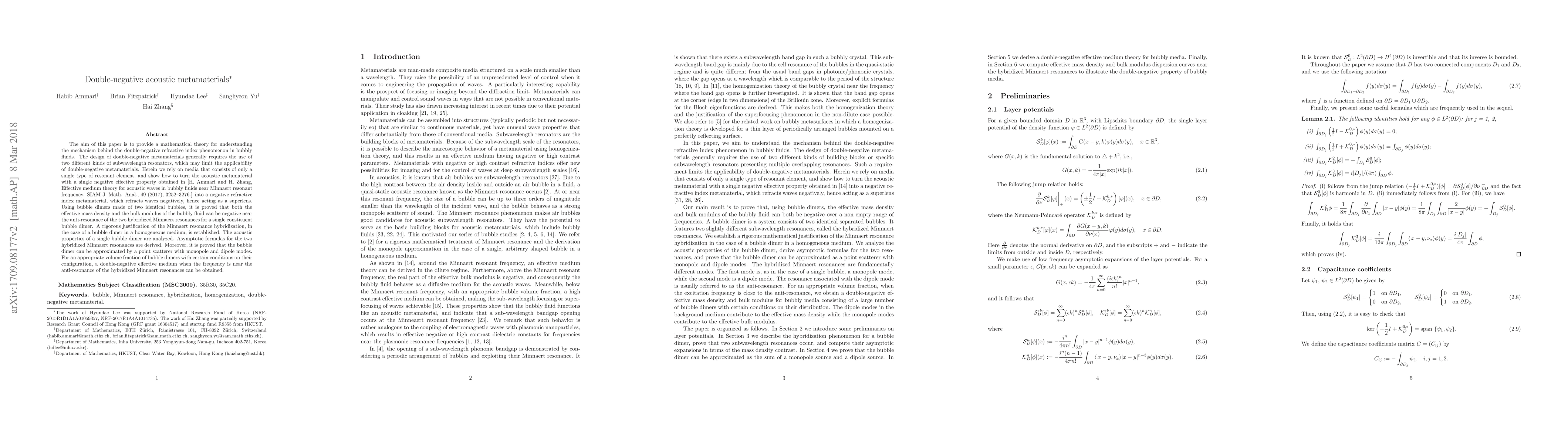 This paper develops a mathematical theory to understand double-negative refractive index phenomena in bubbly fluids using a single type of resonant element. It shows how to transform an acoustic metamaterial into a negative refractive index metamaterial by utilizing bubble dimers, enabling both negative effective mass density and bulk modulus near the anti-resonance of hybridized Minnaert resonances.
