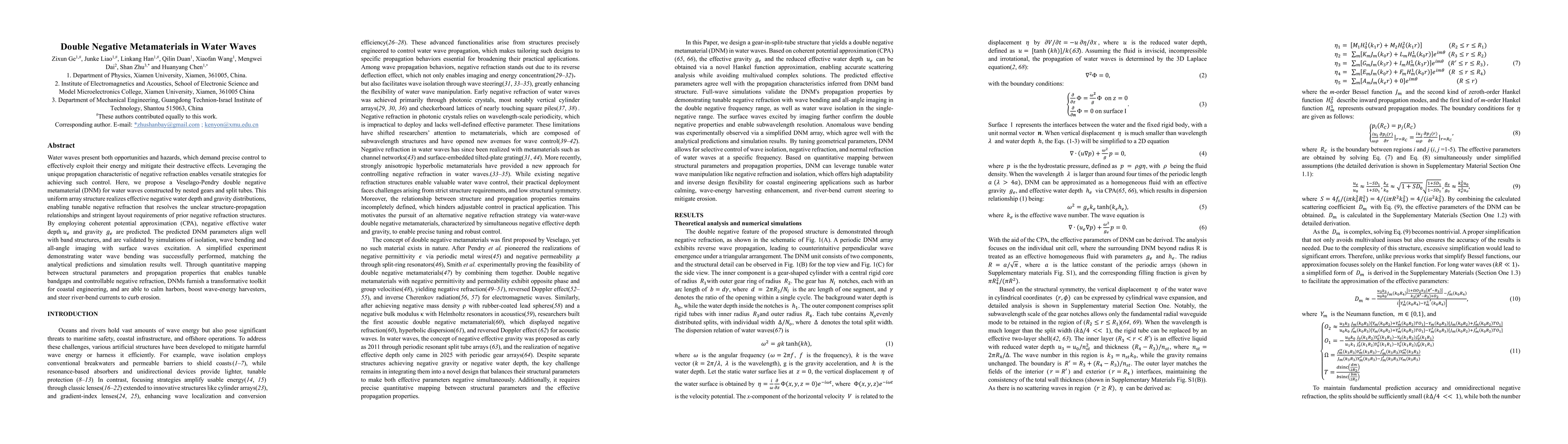 Water waves present both opportunities and hazards, which demand precise control to effectively exploit their energy and mitigate their destructive effects. Leveraging the unique propagation characteristic of negative refraction enables versatile strategies for achieving such control. Here, we propose a Veselago-Pendry double negative metamaterial (DNM) for water waves constructed by nested gears and split tubes. This uniform array structure realizes effective negative water depth and gravity distributions, enabling tunable negative refraction that resolves the unclear structure-propagation relationships and stringent layout requirements of prior negative refraction structures. By employing coherent potential approximation (CPA), negative effective water depth ue and gravity ge are predicted. The predicted DNM parameters align well with band structures, and are validated by simulations of isolation, wave bending and all-angle imaging with surface waves excitation. A simplified experiment demonstrating water wave bending was successfully performed, matching the analytical predictions and simulation results well. Through quantitative mapping between structural parameters and propagation properties that enables tunable bandgaps and controllable negative refraction, DNMs furnish a transformative toolkit for coastal engineering, and are able to calm harbors, boost wave-energy harvesters, and steer river-bend currents to curb erosion.