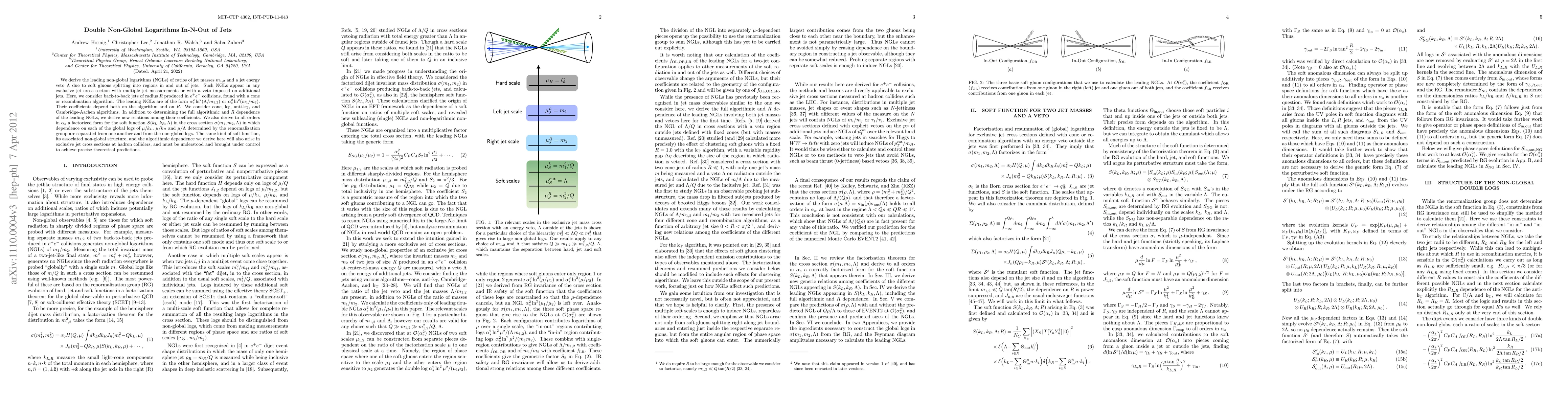 We derive the leading non-global logarithms (NGLs) of ratios of jet masses m_{1,2} and a jet energy veto \Lambda due to soft gluons splitting into regions in and out of jets. Such NGLs appear in any exclusive jet cross section with multiple jet measurements or with a veto imposed on additional jets. Here, we consider back-to-back jets of radius R produced in e^+e^- collisions, found with a cone or recombination algorithm. The leading NGLs are of the form \alpha_s^2 \ln^2(\Lambda/m_{1,2}) or \alpha_s^2\ln^2(m_1/m_2). Their coefficients depend both on the algorithm and on R. We consider cone, \kt, anti-\kt, and Cambridge-Aachen algorithms. In addition to determining the full algorithmic and R dependence of the leading NGLs, we derive new relations among their coefficients. We also derive to all orders in \alpha_s a factorized form for the soft function S(k_L,k_R,\Lambda) in the cross section \sigma(m_1,m_2,\Lambda) in which dependence on each of the global logs of \mu/k_L, \mu/k_R and \mu/\Lambda determined by the renormalization group are separated from one another and from the non-global logs. The same kind of soft function, its associated non-global structure, and the algorithmic dependence we derive here will also arise in exclusive jet cross sections at hadron colliders, and must be understood and brought under control to achieve precise theoretical predictions.