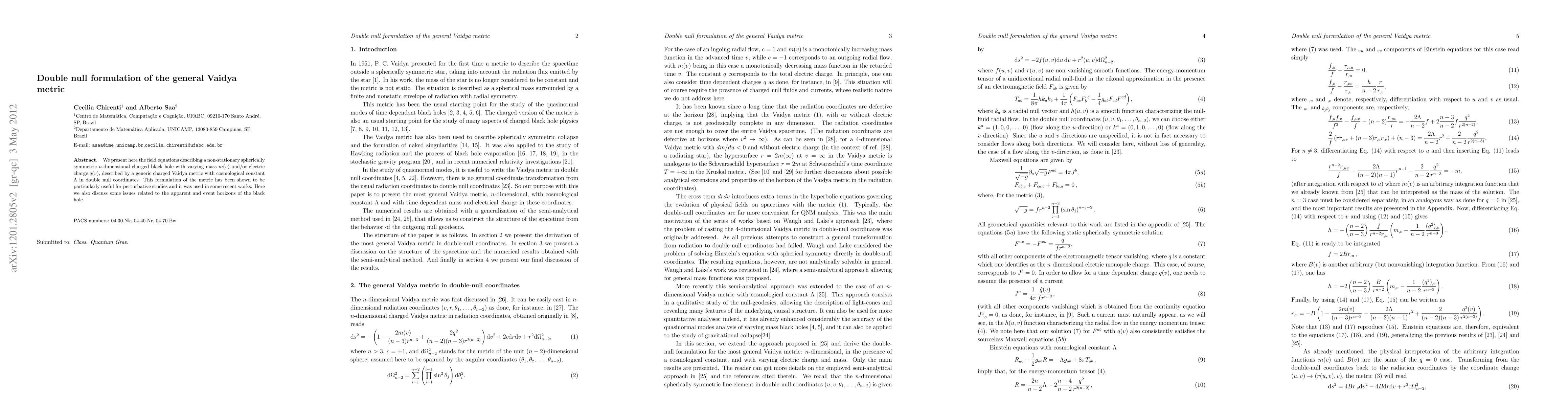This paper presents field equations for a non-stationary, spherically symmetric, n-dimensional charged black hole using a double null formulation of the Vaidya metric, highlighting its utility for perturbative studies and addressing issues related to its apparent and event horizons.