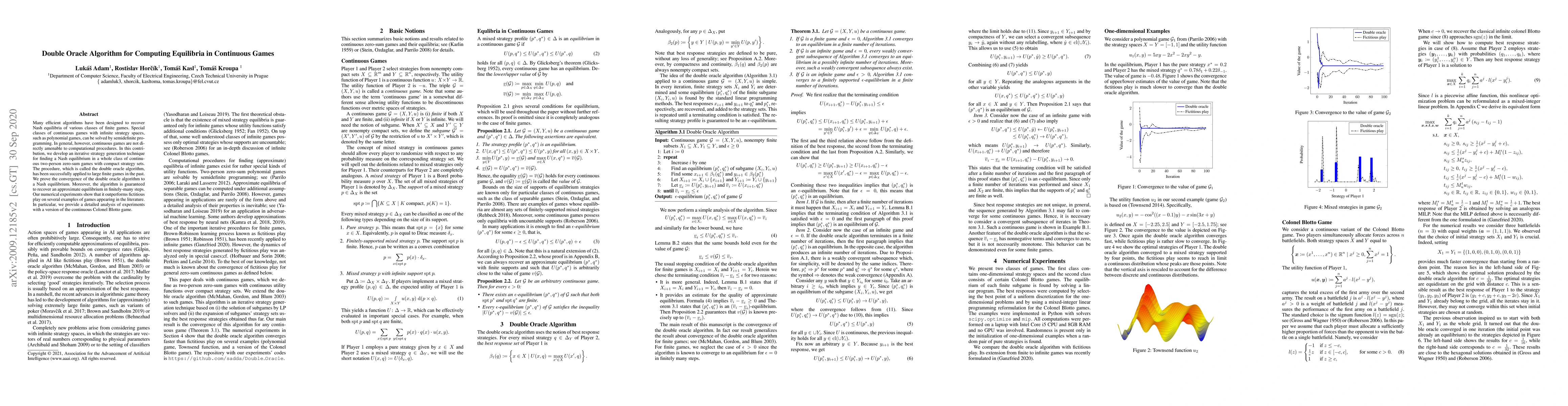 The paper introduces the double oracle algorithm for finding Nash equilibria in continuous two-person zero-sum games with compact strategy sets, proving its convergence and demonstrating its effectiveness through numerical experiments, particularly in continuous Colonel Blotto games. The algorithm outperforms fictitious play in the tested examples.