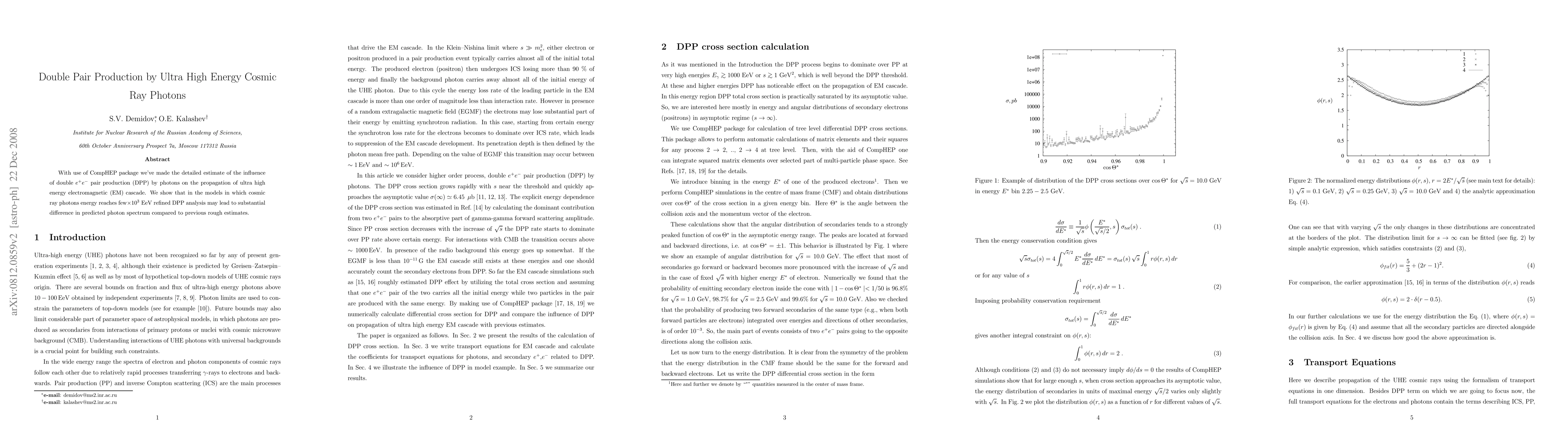 This research uses CompHEP to estimate the impact of double electron-positron pair production by photons (DPP) on ultra high energy electromagnetic cascades. It suggests that refined DPP analysis could significantly alter predicted photon spectra in models where cosmic ray photon energies reach several thousand EeV.