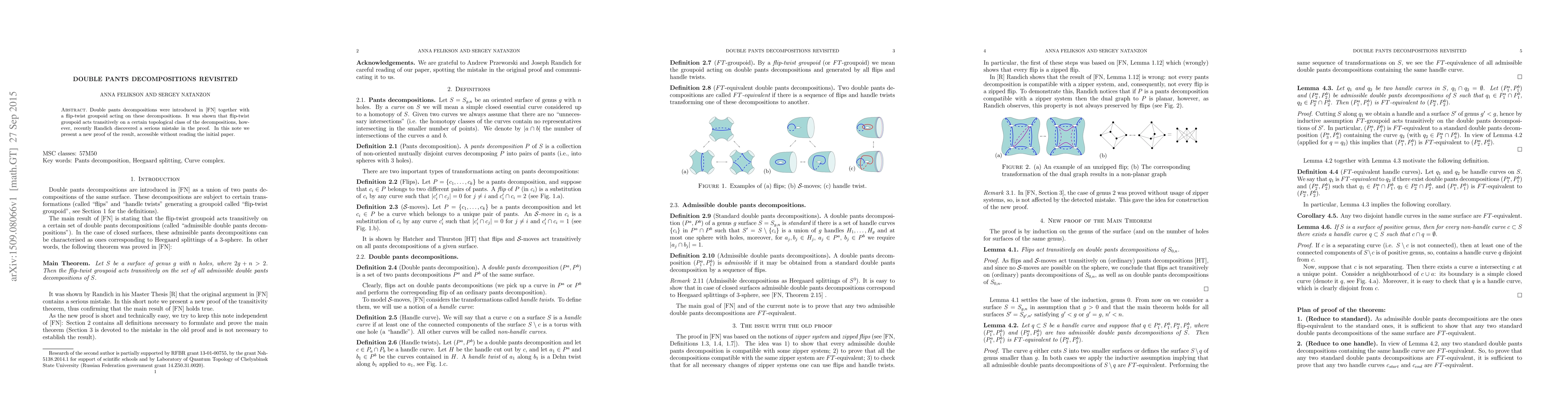 Double pants decompositions were introduced in our paper "Double pants decompositions of 2-surfaces" (Mosc. Math. J. 11 (2011), no. 2, 231-258, arXiv:1005.0073), together with a flip-twist groupoid acting on these decompositions. It was shown that flip-twist groupoid acts transitively on a certain topological class of the decompositions, however, recently Randich discovered a serious mistake in the proof. In this note we present a new proof of the result, accessible without reading the initial paper.