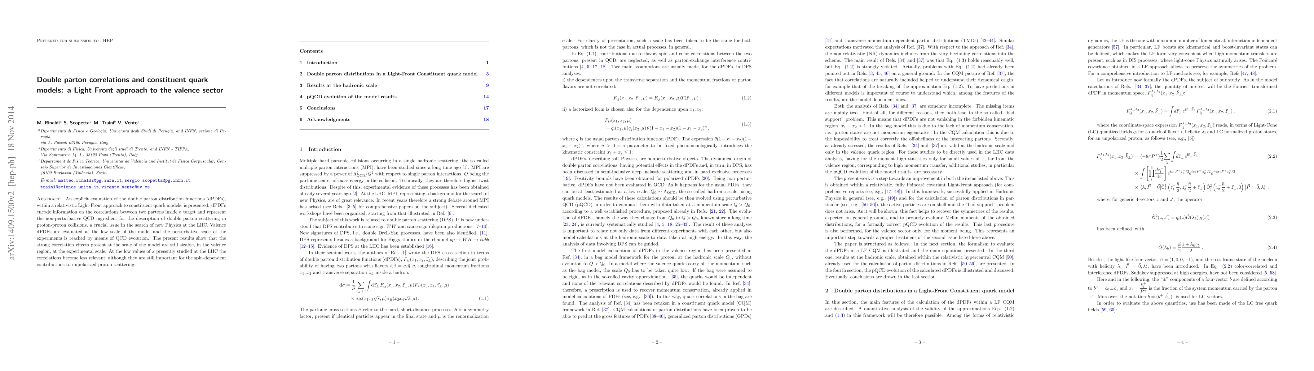 An explicit evaluation of the double parton distribution functions (dPDFs), within a relativistic Light-Front approach to constituent quark models, is presented. dPDFs encode information on the correlations between two partons inside a target and represent the non-perturbative QCD ingredient for the description of double parton scattering in proton-proton collisions, a crucial issue in the search of new Physics at the LHC. Valence dPDFs are evaluated at the low scale of the model and the perturbative scale of the experiments is reached by means of QCD evolution. The present results show that the strong correlation effects present at the scale of the model are still sizable, in the valence region, at the experimental scale. At the low values of x presently studied at the LHC the correlations become less relevant, although they are still important for the spin-dependent contributions to unpolarized proton scattering.