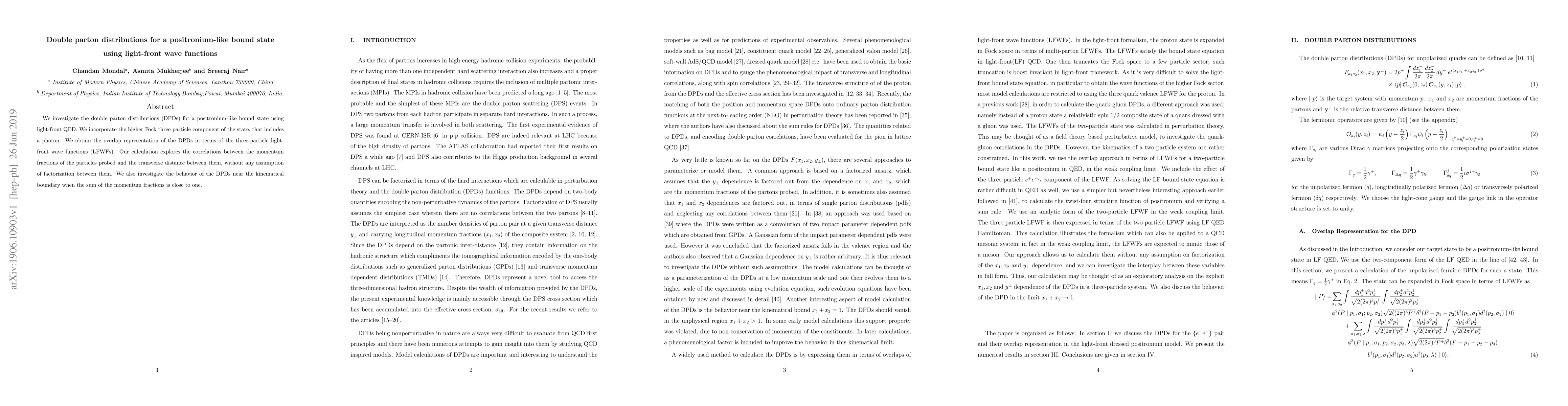 This paper investigates double parton distributions for a positronium-like bound state using light-front QED, incorporating the three-particle component including a photon. It derives the overlap representation of DPDs from three-particle light-front wave functions, exploring correlations without factorization assumptions and examining DPD behavior near the kinematic boundary.