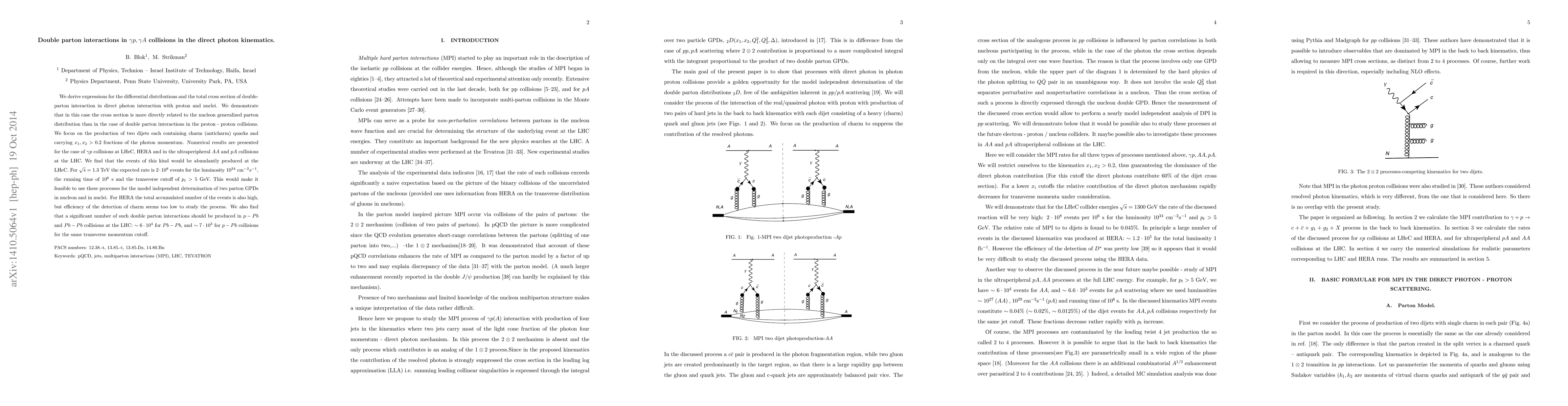 We derive expressions for the differential distributions and the total cross section of double- parton interaction in direct photon interaction with proton and nuclei. We demonstrate that in this case the cross section is more directly related to the nucleon generalized parton distribution than in the case of double parton interactions in the proton - proton collisions. We focus on the production of two dijets each containing charm (anticharm) quarks and carrying $x_1,x_2>0.2$ fractions of the photon momentum. Numerical results are presented for the case of $\gamma p$ collisions at LHeC, HERA and in the ultraperipheral $AA$ and $pA$ collisions at the LHC. We find that the events of this kind would be abundantly produced at the LHeC. For $\sqrt{s}=1.3$ TeV the expected rate is $2\cdot 10^8$ events for the luminosity $10^{34}$ cm$^{-2}s^{-1}$, the running time of $10^6$ s and the transverse cutoff of $p_t>5$ GeV. This would make it feasible to use these processes for the model independent determination of two parton GPDs in nucleon and in nuclei. For HERA the total accumulated number of the events is also high, but efficiency of the detection of charm seems too low to study the process. We also find that a significant number of such double parton interactions should be produced in $p - Pb$ and $Pb- Pb$ collisions at the LHC: $\sim 6\cdot 10^4$ for $Pb-Pb$, and $\sim 7 \cdot 10^3$ for $p-Pb$ collisions for the same transverse momentum cutoff.