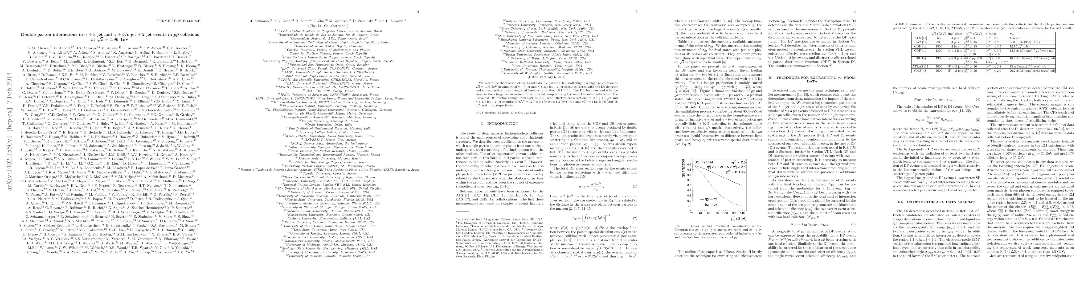 This study measures the fraction of double parton scattering events in photon + 3 jet and photon + b/c jet + 2 jet samples from ppbar collisions at sqrt{s}=1.96 TeV using the D0 detector. The measured double parton scattering fractions range from 0.21 to 0.17, with corresponding effective cross sections of 12.7 mb and 14.6 mb.