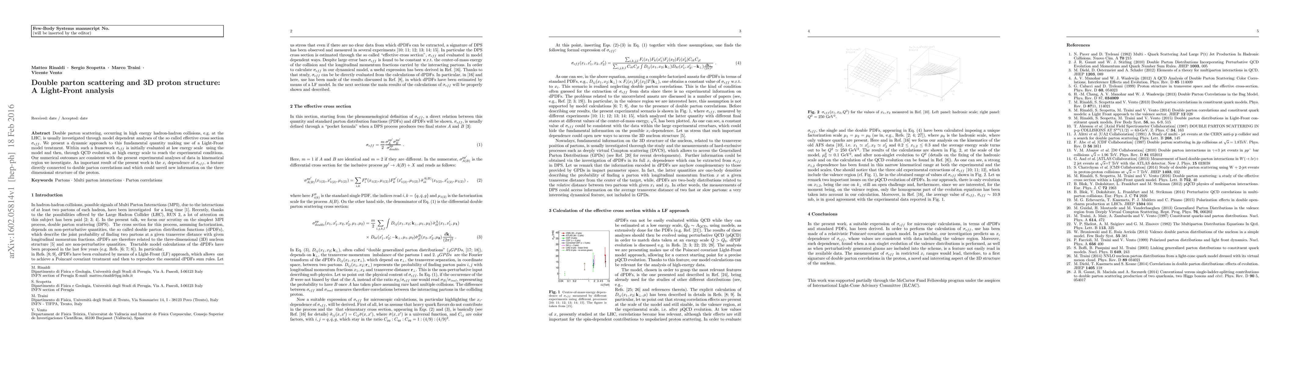 This paper presents a dynamic analysis of double parton scattering using a Light-Front model, evaluating the effective cross section $\sigma_{eff}$ at low energy scales and evolving it to high energy scales via QCD. The study reveals an important $x_i$ dependence of $\sigma_{eff}$, which provides new insights into the three-dimensional structure of the proton.