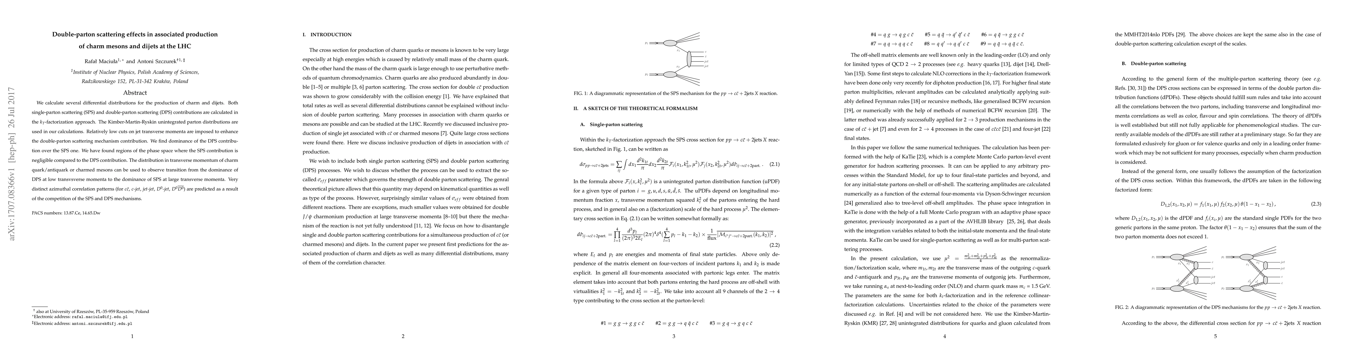 We calculate several differential distributions for the production of charm and dijets. Both single-parton scattering (SPS) and double-parton scattering (DPS) contributions are calculated in the $k_T$-factorization approach. The Kimber-Martin-Ryskin unintegrated parton distributions are used in our calculations. Relatively low cuts on jet transverse momenta are imposed to enhance the double-parton scattering mechanism contribution. We find dominance of the DPS contribution over the SPS one. We have found regions of the phase space where the SPS contribution is negligible compared to the DPS contribution. The distribution in transverse momentum of charm quark/antiquark or charmed mesons can be used to observe transition from the dominance of DPS at low transvsverse momenta to the dominance of SPS at large transverse momenta. Very distinct azimuthal correlation patterns (for $c \bar{c}$, $c\mathrm{\textit{-jet}}$, $\mathrm{\textit{jet-jet}}$, $D^0\mathrm{\textit{-jet}}$, $D^0 D^0$) are predicted as a result of the competition of the SPS and DPS mechanisms.