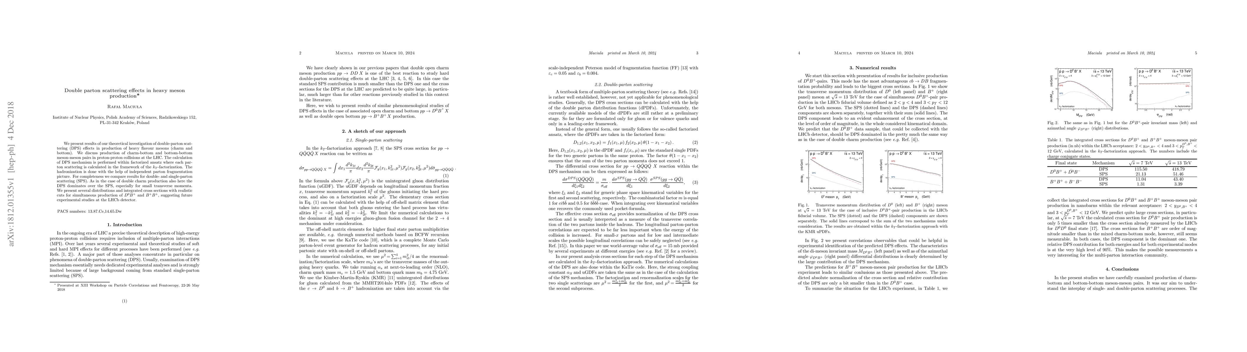 This paper investigates double-parton scattering (DPS) effects in the production of heavy flavor mesons, specifically charm and bottom pairs, in proton-proton collisions at the LHC. The study finds that DPS dominates over single-parton scattering, especially for small transverse momenta, and provides distributions and cross sections for future experimental studies at LHCb.
