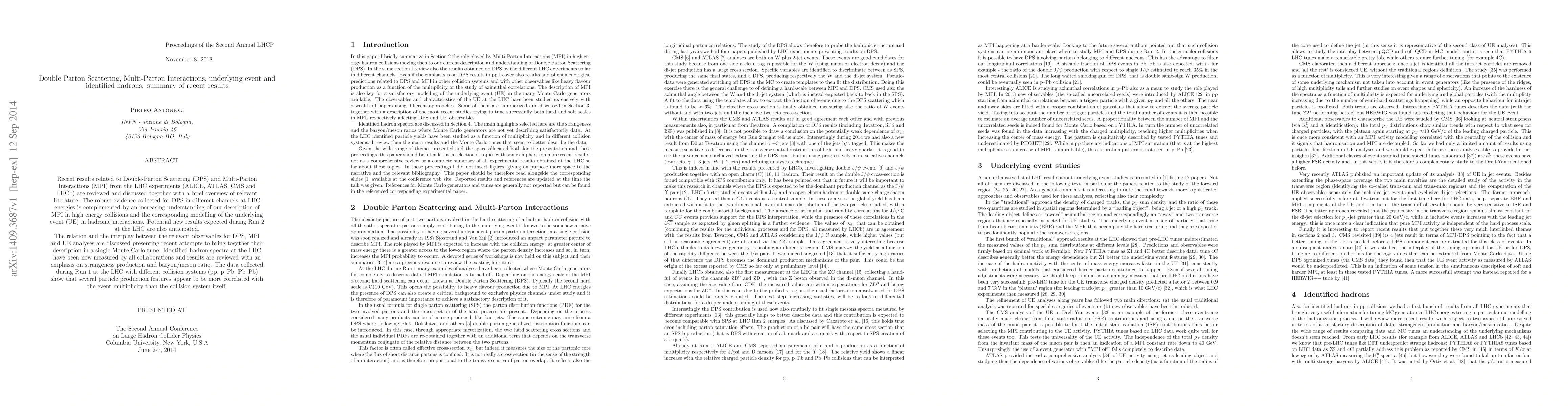 Recent results related to Double-Parton Scattering (DPS) and Multi-Parton Interactions (MPI) from the LHC experiments (ALICE, ATLAS, CMS and LHCb) are reviewed and discussed together with a brief overview of relevant literature. The robust evidence collected for DPS in different channels at LHC energies is complemented by an increasing understanding of our description of MPI in high energy collisions and the corresponding modelling of the underlying event (UE) in hadronic interactions. Potential new results expected during Run 2 at the LHC are also anticipated. The relation and the interplay between the relevant observables for DPS, MPI and UE analyses are discussed presenting recent attempts to bring together their description in a single Monte Carlo tune. Identified hadron spectra at the LHC have been now measured by all collaborations and results are reviewed with an emphasis on strangeness production and baryon/meson ratio. The data collected during Run 1 at the LHC with different collision systems (pp, p-Pb, Pb-Pb) show that several particle production features appear to be more correlated with the event multiplicity than the collision system itself.