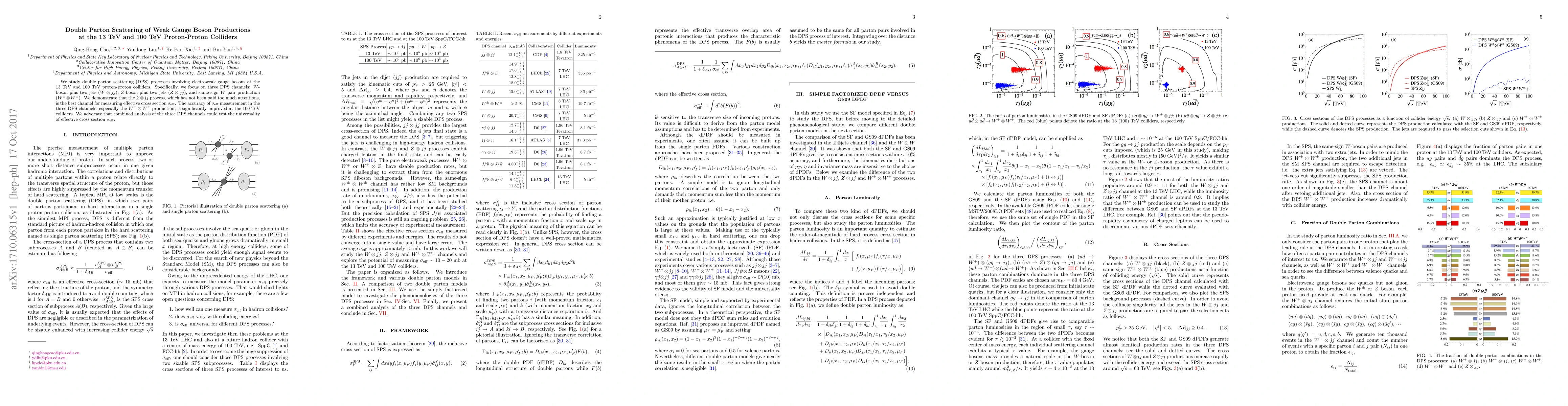This paper investigates double parton scattering (DPS) processes involving electroweak gauge bosons at 13 TeV and 100 TeV proton-proton colliders, focusing on three channels: $W\otimes jj$, $Z\otimes jj$, and $W^\pm\otimes W^\pm$. The $Z\otimes jj$ channel is identified as optimal for measuring effective cross section $\sigma_{\rm eff}$, with significant improvements at the 100 TeV collider.
