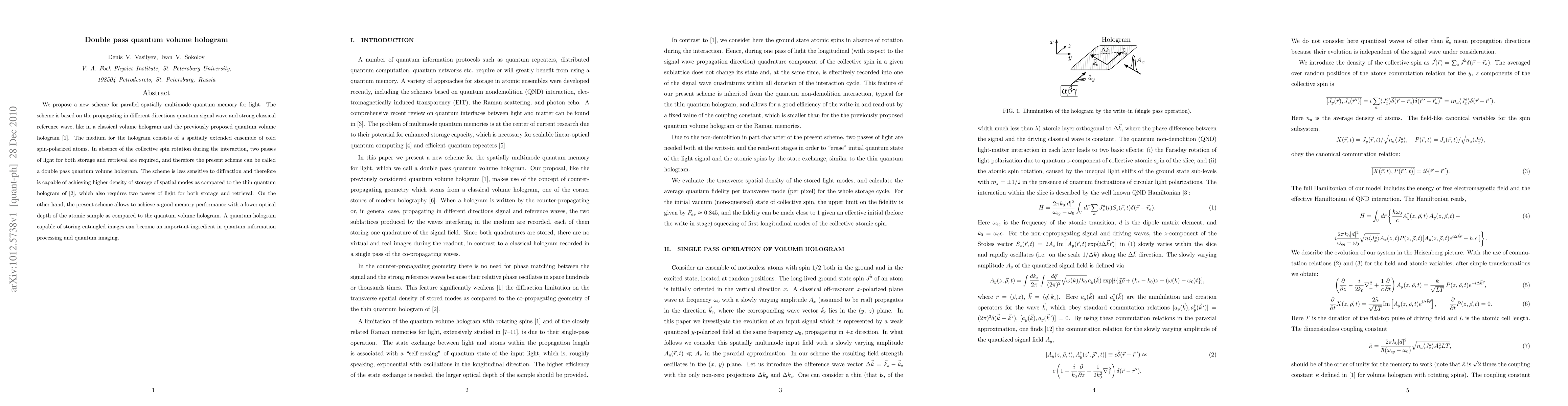 We propose a new scheme for parallel spatially multimode quantum memory for light. The scheme is based on the propagating in different directions quantum signal wave and strong classical reference wave, like in a classical volume hologram and the previously proposed quantum volume hologram [Phys. Rev. A 81, 020302(R)(2010)]. The medium for the hologram consists of a spatially extended ensemble of cold spin-polarized atoms. In absence of the collective spin rotation during the interaction, two passes of light for both storage and retrieval are required, and therefore the present scheme can be called a double pass quantum volume hologram. The scheme is less sensitive to diffraction and therefore is capable of achieving higher density of storage of spatial modes as compared to the thin quantum hologram of [Phys. Rev. A 77, 020302(R)(2008)], which also requires two passes of light for both storage and retrieval. On the other hand, the present scheme allows to achieve a good memory performance with a lower optical depth of the atomic sample as compared to the quantum volume hologram. A quantum hologram capable of storing entangled images can become an important ingredient in quantum information processing and quantum imaging.