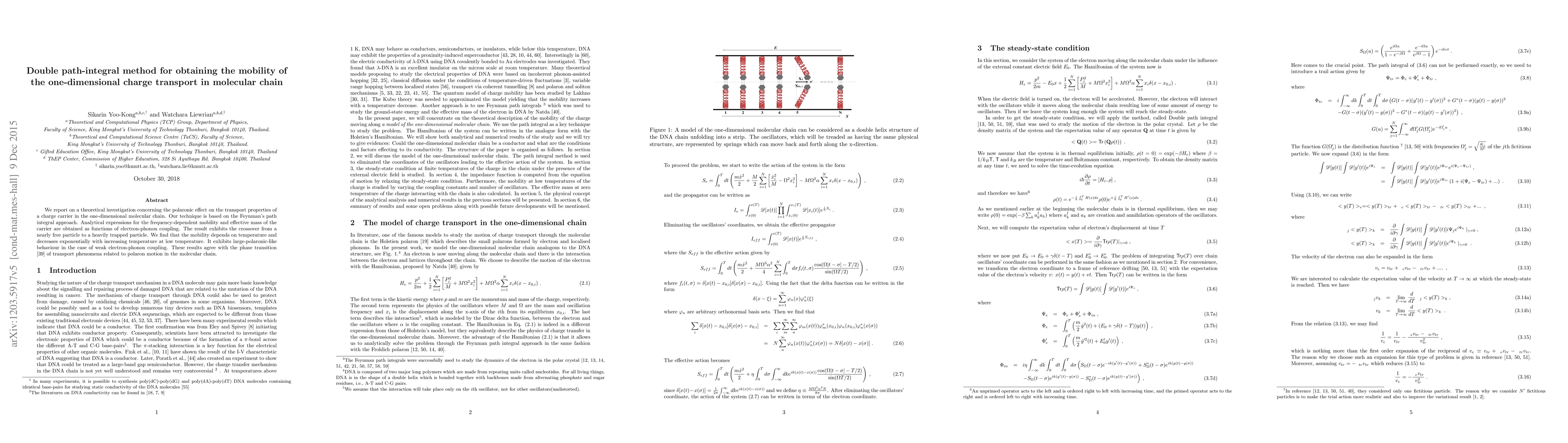 We report on a theoretical investigation concerning the polaronic effect on the transport properties of a charge carrier in the one-dimensional molecular chain. Our technique is based on the Feynman's path integral approach. Analytical expressions for the frequency-dependent mobility and effective mass of the carrier are obtained as functions of electron-phonon coupling. The result exhibits the crossover from a nearly free particle to a heavily trapped particle. We find that the mobility depends on temperature and decreases exponentially with increasing temperature at low temperature. It exhibits large-polaronic-like behaviour in the case of weak electron-phonon coupling. These results agree with the phase transition \cite{Mish} of transport phenomena related to polaron motion in the molecular chain.