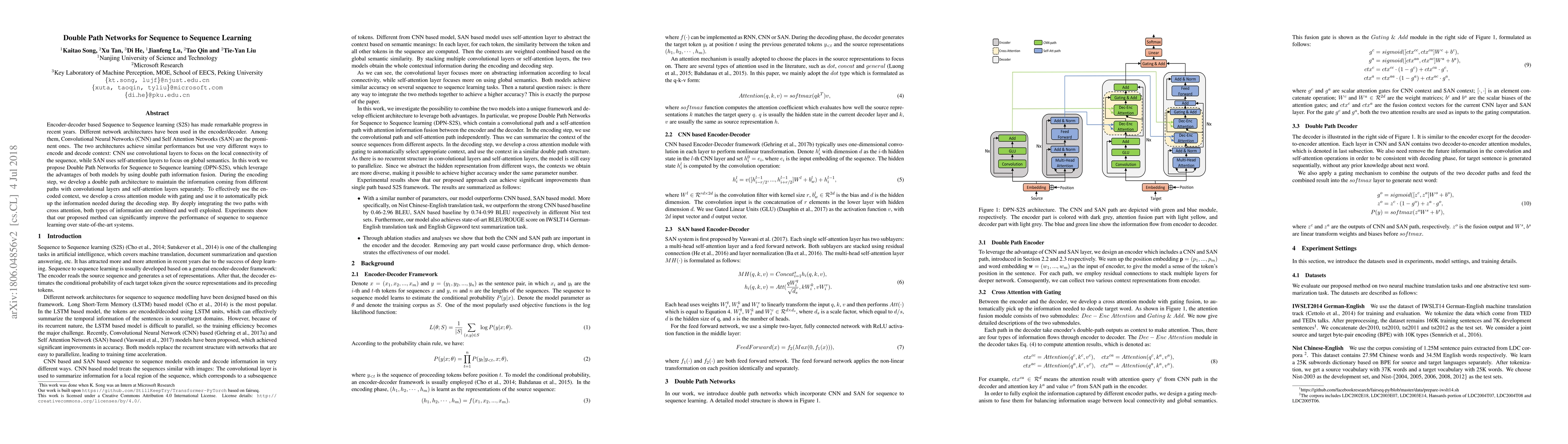 The paper proposes Double Path Networks for Sequence to Sequence learning (DPN-S2S), combining Convolutional Neural Networks and Self Attention Networks to leverage their respective strengths. The method uses separate convolutional and self-attention layers for encoding, followed by a cross attention module for decoding, achieving superior performance over existing models.