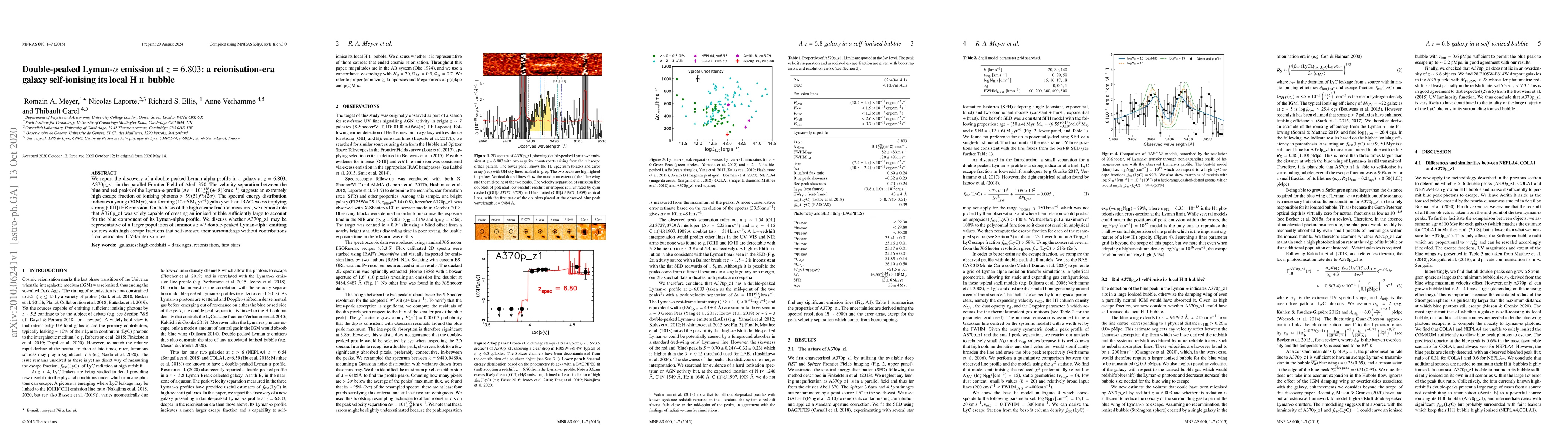 This paper reports a double-peaked Lyman-$\alpha$ emission in a galaxy at $z=6.803$, indicating a high escape fraction of ionising photons. The galaxy, A370p\_z1, is capable of self-ionising its local HII bubble, suggesting it may represent a class of luminous, early-universe galaxies.