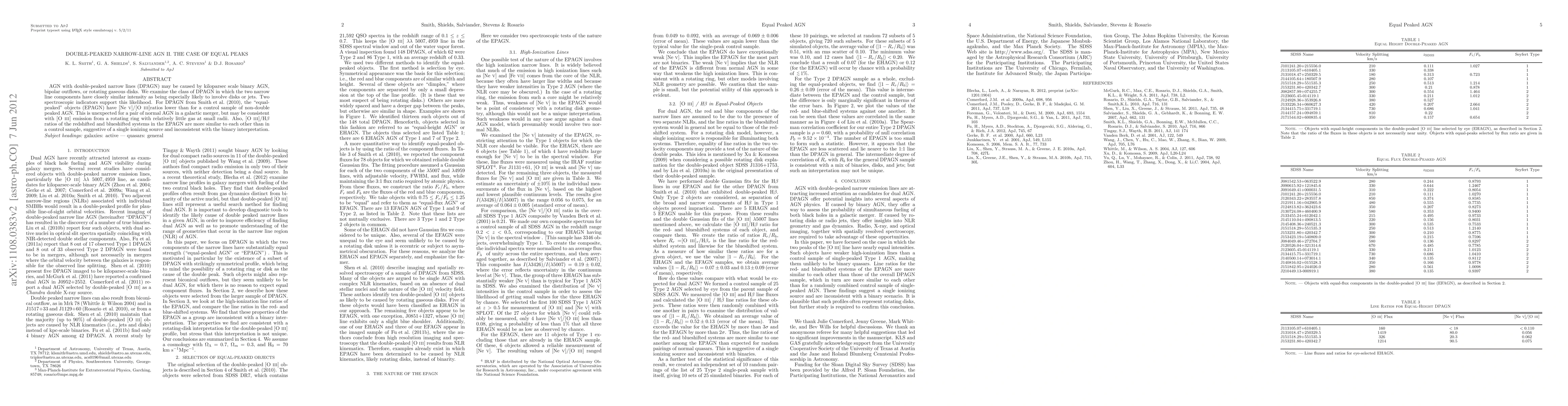 AGN with double-peaked narrow lines (DPAGN) may be caused by kiloparsec scale binary AGN, bipolar outflows, or rotating gaseous disks. We examine the class of DPAGN in which the two narrow line components have closely similar intensity as being especially likely to involve disks or jets. Two spectroscopic indicators support this likelihood. For DPAGN from Smith et al. (2010), the "equal-peaked" objects (EPAGN) have [Ne V]/[O III] ratios lower than for a control sample of non-double peaked AGN. This is unexpected for a pair of normal AGN in a galactic merger, but may be consistent with [O III] emission from a rotating ring with relatively little gas at small radii. Also, [O III]/H-beta ratios of the redshifted and blueshifted systems in the EPAGN are more similar to each other than in a control sample, suggestive of a single ionizing source and inconsistent with the binary interpretation.