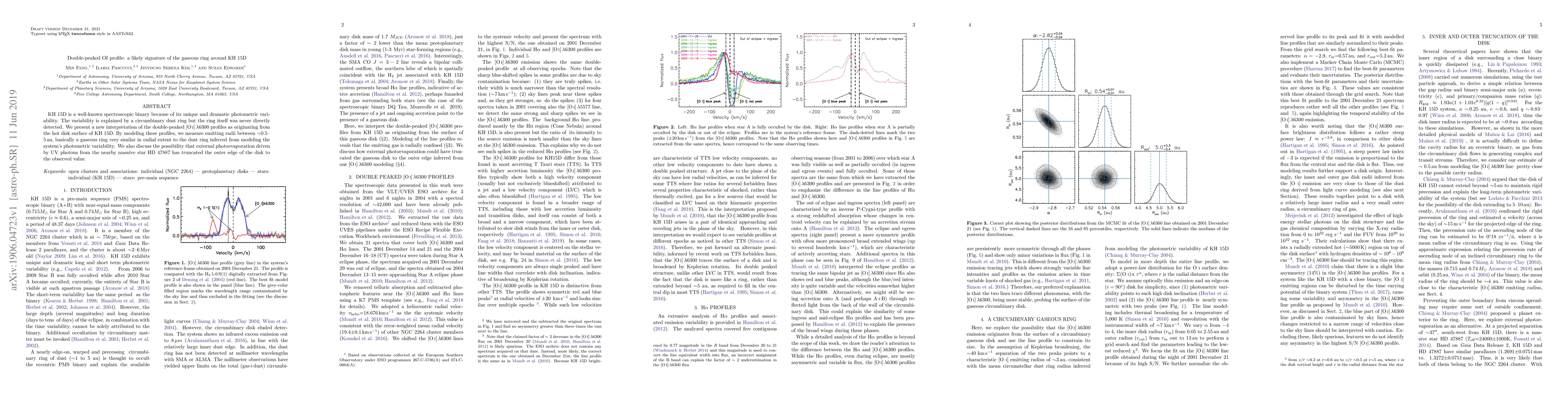 The paper interprets double-peaked [O~I] λ6300 profiles as evidence of a gaseous ring around the spectroscopic binary KH 15D, suggesting it is similar in radial extent to the previously inferred dust ring. The study also explores the potential impact of UV photons from nearby star HD 47887 on truncating the outer edge of the gaseous ring.