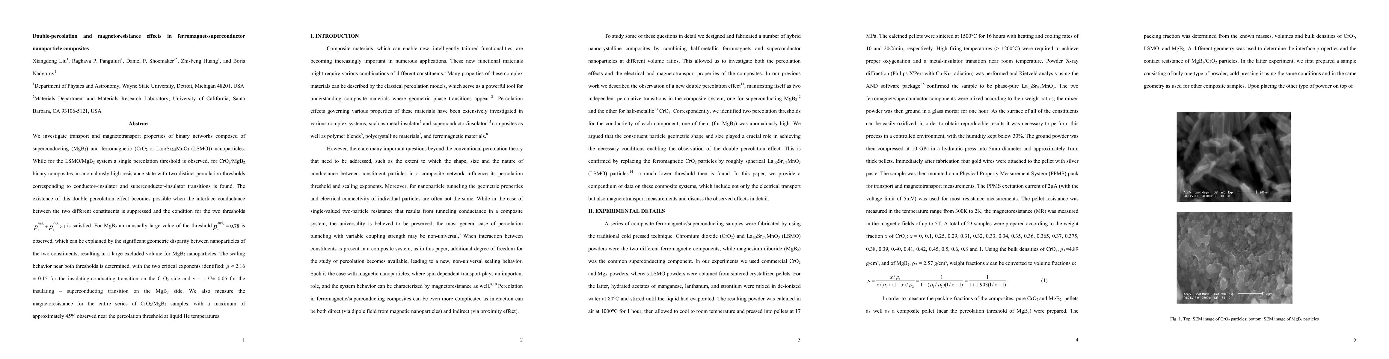 This paper explores the transport and magnetotransport properties of ferromagnet-superconductor nanoparticle composites, revealing a double-percolation effect in CrO2/MgB2 systems with two distinct percolation thresholds. The study identifies critical exponents and observes a significant magnetoresistance peak near the percolation threshold.