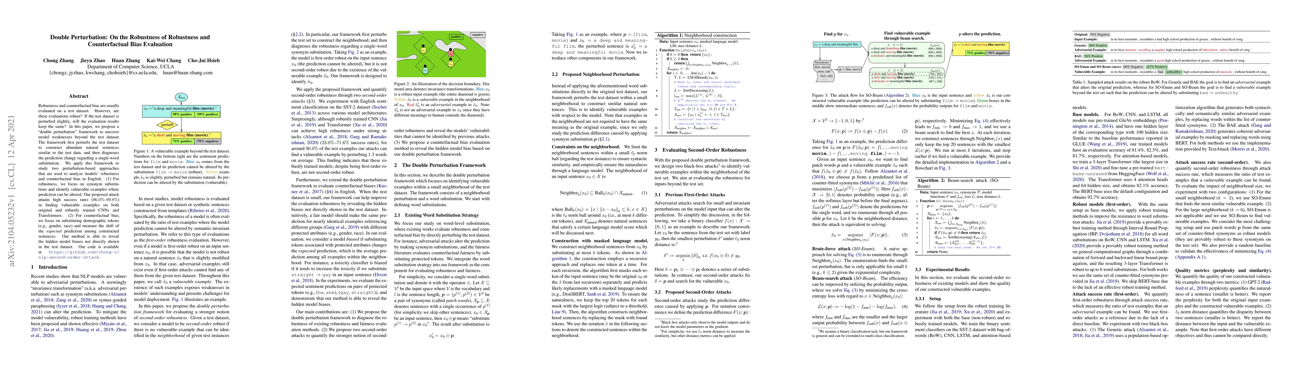 Robustness and counterfactual bias are usually evaluated on a test dataset. However, are these evaluations robust? If the test dataset is perturbed slightly, will the evaluation results keep the same? In this paper, we propose a "double perturbation" framework to uncover model weaknesses beyond the test dataset. The framework first perturbs the test dataset to construct abundant natural sentences similar to the test data, and then diagnoses the prediction change regarding a single-word substitution. We apply this framework to study two perturbation-based approaches that are used to analyze models' robustness and counterfactual bias in English. (1) For robustness, we focus on synonym substitutions and identify vulnerable examples where prediction can be altered. Our proposed attack attains high success rates (96.0%-99.8%) in finding vulnerable examples on both original and robustly trained CNNs and Transformers. (2) For counterfactual bias, we focus on substituting demographic tokens (e.g., gender, race) and measure the shift of the expected prediction among constructed sentences. Our method is able to reveal the hidden model biases not directly shown in the test dataset. Our code is available at https://github.com/chong-z/nlp-second-order-attack.