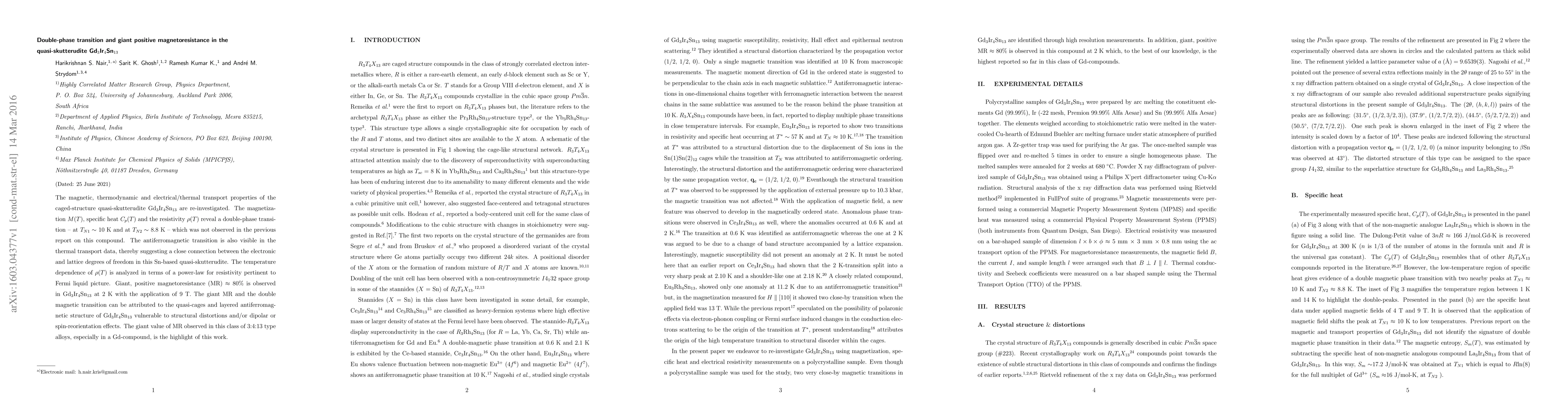 The magnetic, thermodynamic and electrical/thermal transport properties of the caged-structure quasi-skutterudite Gd$_3$Ir$_4$Sn$_{13}$ are re-investigated. The magnetization $M(T)$, specific heat $C_p(T)$ and the resistivity $\rho(T)$ reveal a double-phase transition -- at $T_{N1}\sim$ 10~K and at $T_{N2}\sim$ 8.8~K -- which was not observed in the previous report on this compound. The antiferromagnetic transition is also visible in the thermal transport data, thereby suggesting a close connection between the electronic and lattice degrees of freedom in this Sn-based quasi-skutterudite. The temperature dependence of $\rho(T)$ is analyzed in terms of a power-law for resistivity pertinent to Fermi liquid picture. Giant, positive magnetoresistance (MR) $\approx$ 80$\%$ is observed in Gd$_3$Ir$_4$Sn$_{13}$ at 2~K with the application of 9~T. The giant MR and the double magnetic transition can be attributed to the quasi-cages and layered antiferromagnetic structure of Gd$_3$Ir$_4$Sn$_{13}$ vulnerable to structural distortions and/or dipolar or spin-reorientation effects. The giant value of MR observed in this class of 3:4:13 type alloys, especially in a Gd-compound, is the highlight of this work.