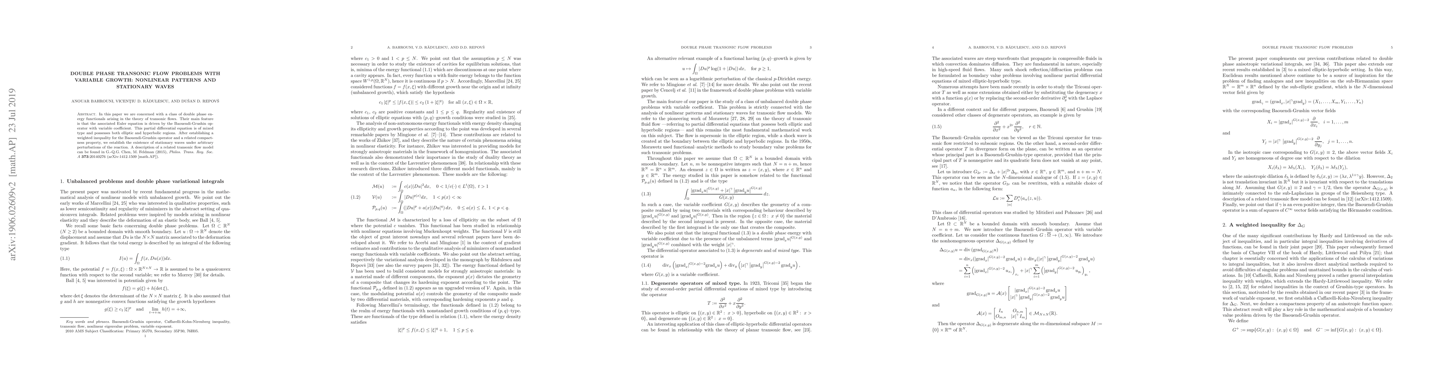 In this paper we are concerned with a class of double phase energy functionals arising in the theory of transonic flows. Their main feature is that the associated Euler equation is driven by the Baouendi-Grushin operator with variable coefficient. This partial differential equation is of mixed type and possesses both elliptic and hyperbolic regions. After establishing a weighted inequality for the Baouendi-Grushin operator and a related compactness property, we establish the existence of stationary waves under arbitrary perturbations of the reaction.