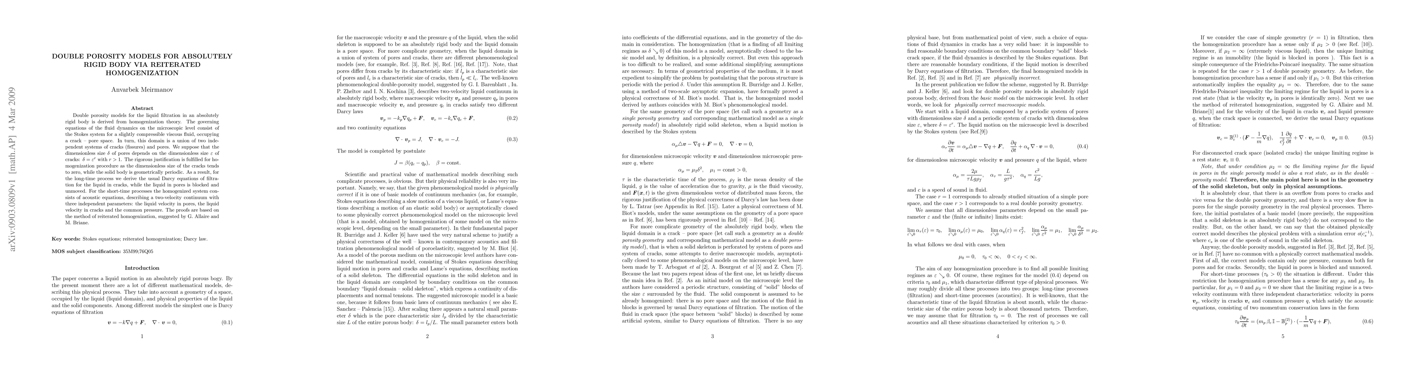 Double porosity models for the liquid filtration in an absolutely rigid body is derived from homogenization theory. The governing equations of the fluid dynamics on the microscopic level consist of the Stokes system for a slightly compressible viscous fluid, occupying a crack -- pore space. In turn, this domain is a union of two independent systems of cracks (fissures) and pores. We suppose that the dimensionless size $\delta$ of pores depends on the dimensionless size $\varepsilon$ of cracks: $\delta=\varepsilon^{r}$ with $r>1$. The rigorous justification is fulfilled for homogenization procedure as the dimensionless size of the cracks tends to zero, while the solid body is geometrically periodic. As a result, for the long-time process we derive the usual Darcy equations of filtration for the liquid in cracks, while the liquid in pores is blocked and unmoved. For the short-time processes the homogenized system consists of acoustic equations, describing a two-velocity continuum with three independent parameters: the liquid velocity in pores, the liquid velocity in cracks and the common pressure. The proofs are based on the method of reiterated homogenization, suggested by G. Allaire and M. Briane.