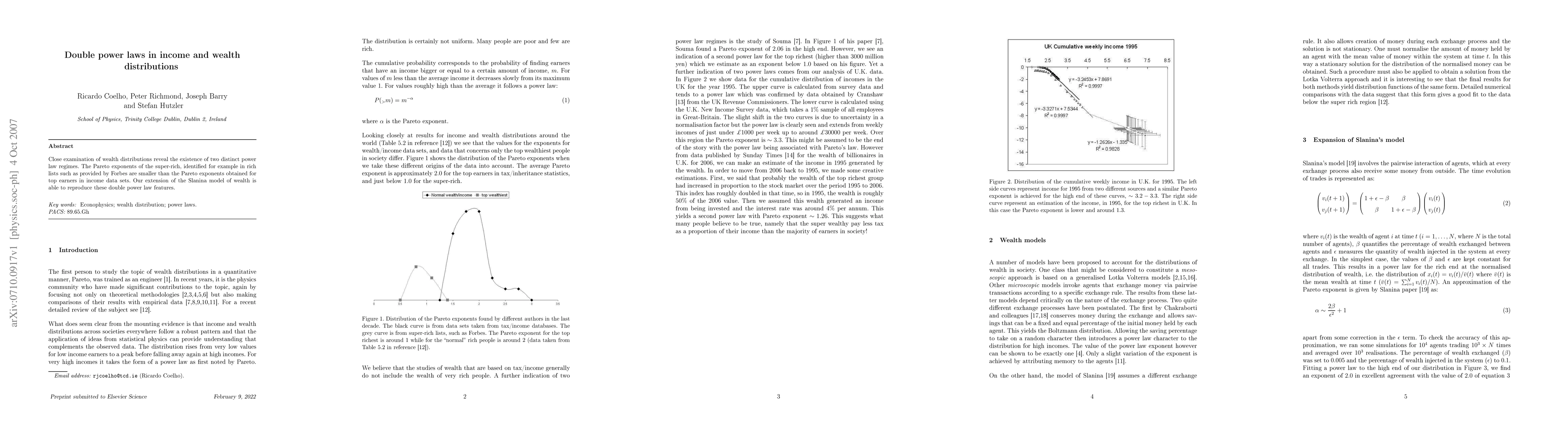 This paper identifies two distinct power law regimes in wealth distributions, with different Pareto exponents for the super-rich compared to top earners. The authors extend the Slanina model to successfully replicate these dual power law characteristics.